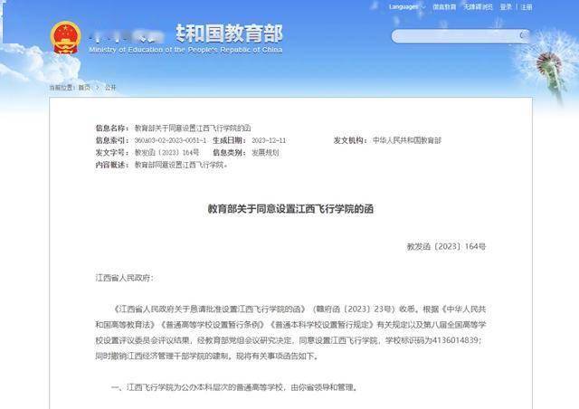 2023年12月,教育部官网发布《教育部关于同意设置江西飞行学院的函》,正式同意设置江西飞行学院