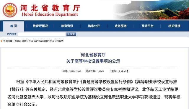 12月5日,河北省教育厅发布关于高等学校设置事项的公示。