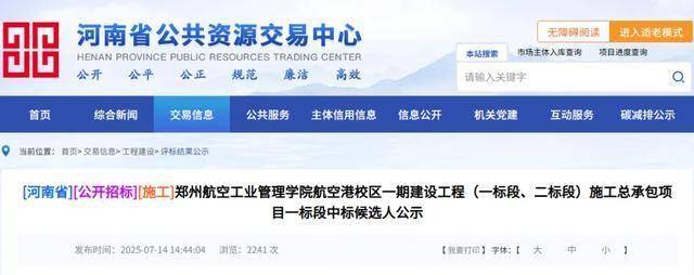 据河南省公共资源交易中心7月14日公示信息,郑州航空工业管理学院航空港校区一期建设工程(一标段、二标段)施工总承包项目一标段中标候选人公布。同月,学校召开筹建郑州航空航天大学工作推进会,校长邓中亮介绍了筹建工作取得的重要进展。这意味着,学校离郑州航空航天大学又近了一步。