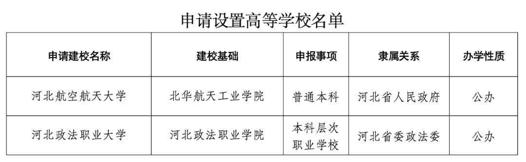 根据《中华人民共和国高等教育法》《普通高等学校设置暂行条例》《高等职业学校设置标准(暂行)》等有关规定,经河北省高等学校设置评议委员会专家考察和评议,北华航天工业学院更名河北航空航天大学、以河北政法职业学院为基础设立河北政法职业大学事项获得通过,现将学校名单向社会公示。