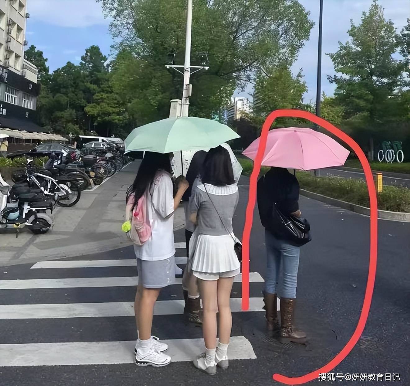 这张照片里几个女生就穿着当下比较时行的装束,站在一起打着雨伞。而且由于背景是大学校园,所以一看就是学生,并没有什么太大的差异。