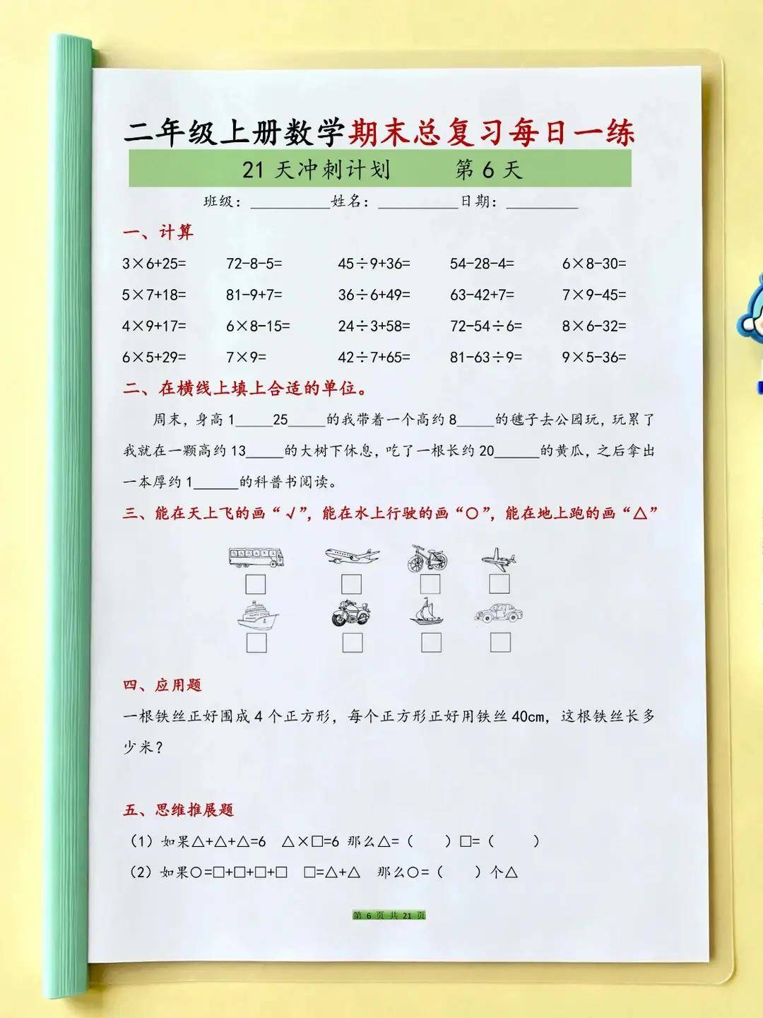 有了这份 21 天冲刺练,孩子不用再盲目刷题:每天跟着模块练,计算会更熟练、基础更扎实、应用题思路更清晰,就连难搞的思维拓展题也能慢慢掌握;家长辅导也省心,不用再费心筛选题目,跟着计划每天督促孩子练 1 页,就能直观看到孩子的进步。比如练完 “正方形铁丝长度” 应用题,孩子再遇到类似题目,能直接想到 “正方形周长 = 边长 ×4”,轻松算出答案;练熟 “乘法口诀逆用”,看到 “( )×8=48”,不用犹豫就能填出 “6”,期末基础题不丢分,总成绩自然稳!