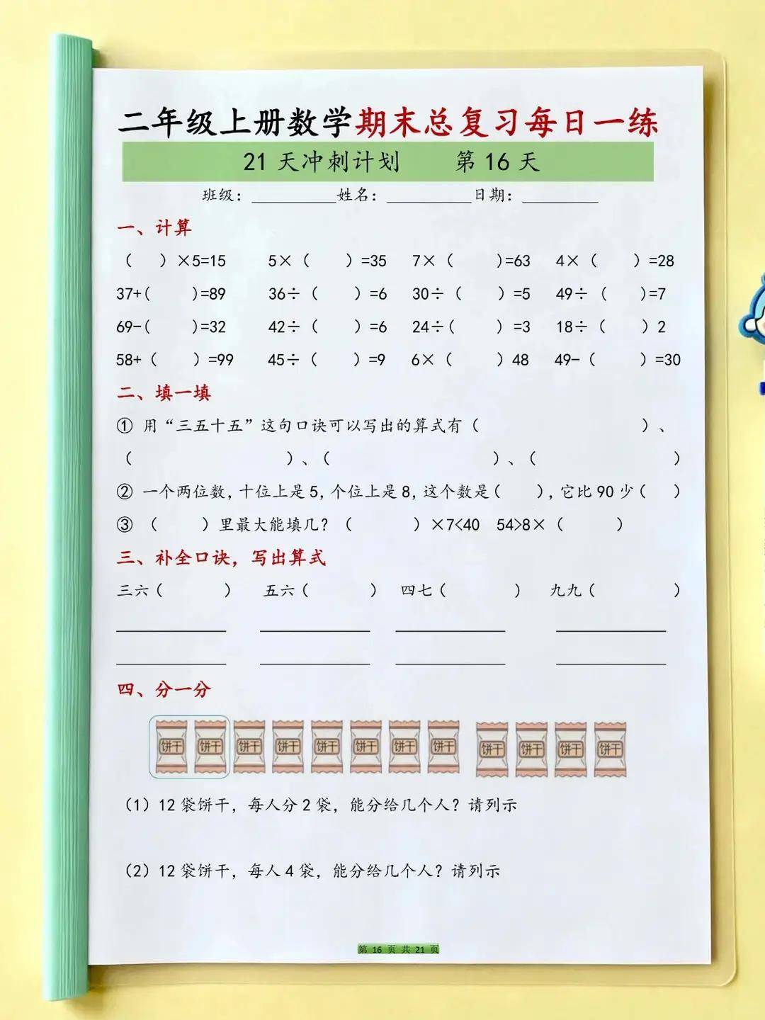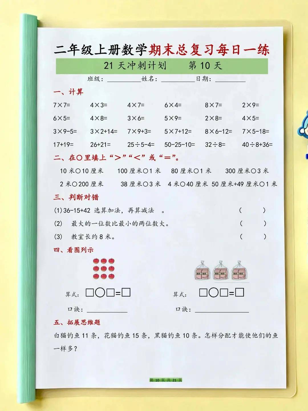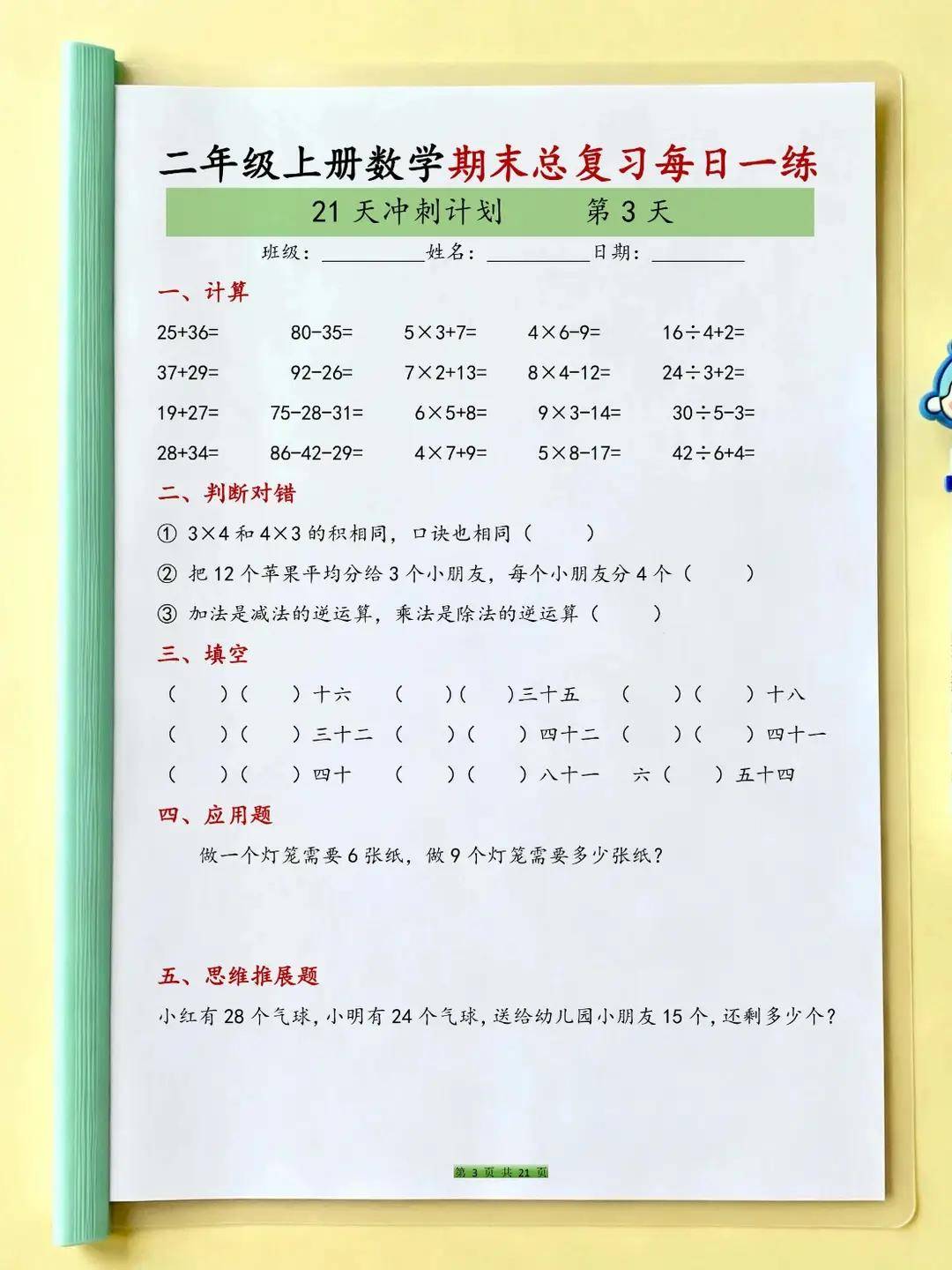 二年级上册数学期末复习没方向?怕计算不熟练、单位填错、应用题卡壳?别愁!2025 秋小学二年级上册数学【期末 21 天冲刺练(每日一练)】太香了!这份每日一练直接把期末考点焊死,从基础计算到思维拓展全维度拿捏,帮孩子每天练一点、稳步提分,期末应试超有底气!