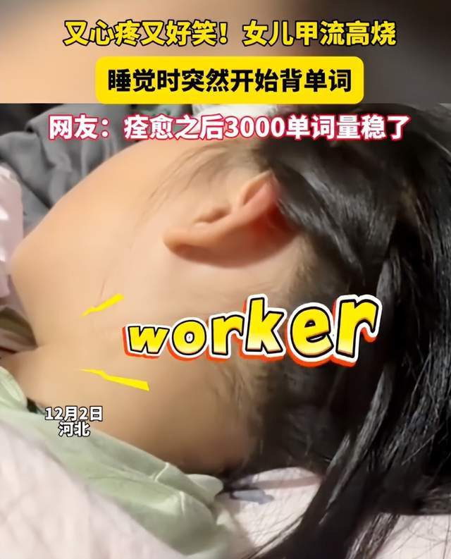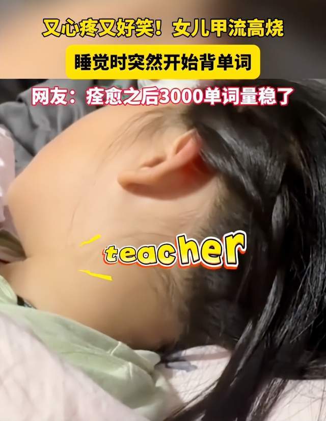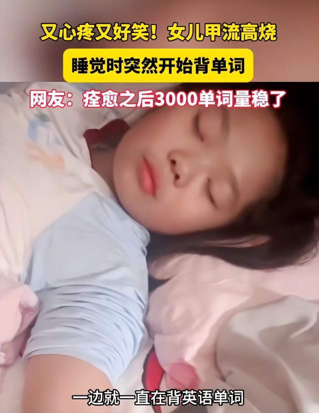 河北一女孩因甲流高烧吃完药就睡觉,结果没想到女孩子竟然一边睡觉,一边在在睡梦中无意识狂背英语单词,其母亲记录了下来,称既心疼又好笑,孩子清醒后完全不记得自己说什么。该事件引起网友共鸣,有网友表示:我女儿睡梦里说你干嘛吃我东西,有网友则表示:不好笑,这是多大的压力。由此可以看出大家看到生病中小女孩还在拼命学习,确实让人心疼,同时也从侧面说明孩子们的学习压力大,时刻都在紧张学习的状态,就算是请假也没有完全放下学习压力,还想着学业。