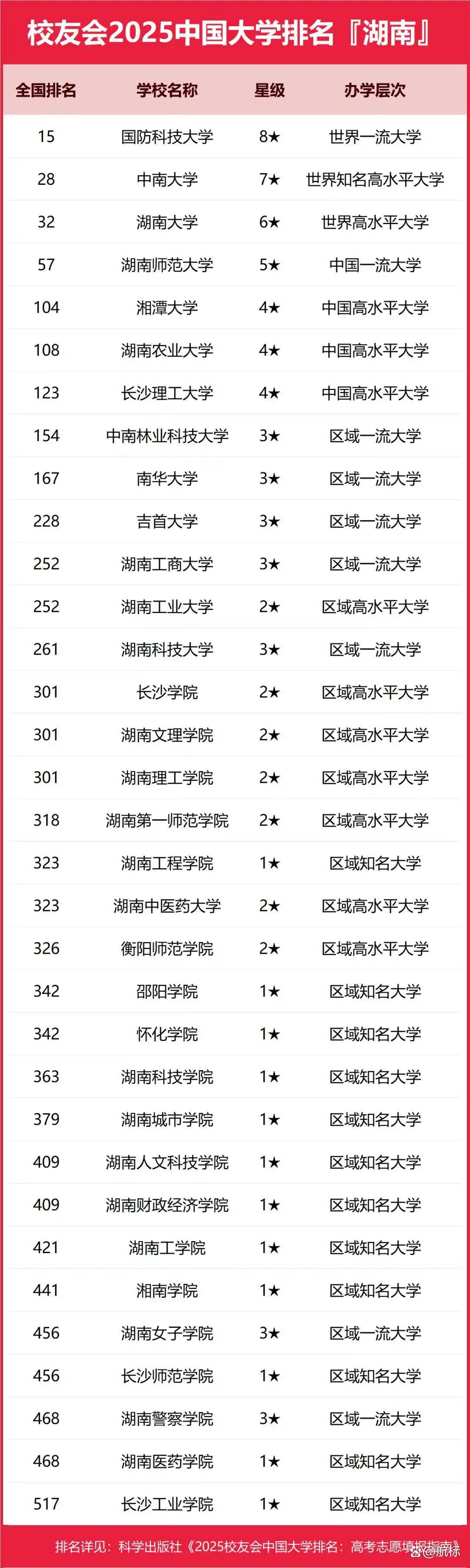 2025 年校友会中国大学排名新鲜出炉,湖南高校的表现堪称 “稳中有进”—— 既有顶尖学府锚定全国第一梯队,也有特色院校在细分赛道跑出加速度。作为中部高教重镇,湖南近年以 “双一流” 建设为牵引,推动高校与国防、产业需求深度绑定,这次排名正是这份耕耘的直观注脚:从 8 星 “世界一流” 到区域特色院校,湖南高教的 “层次拼图” 愈发清晰。