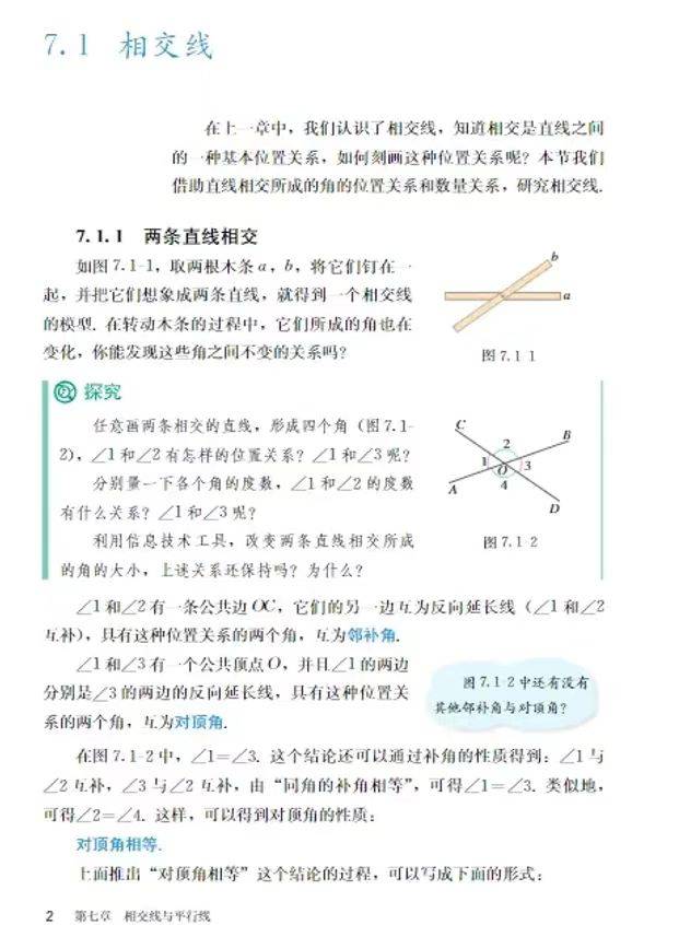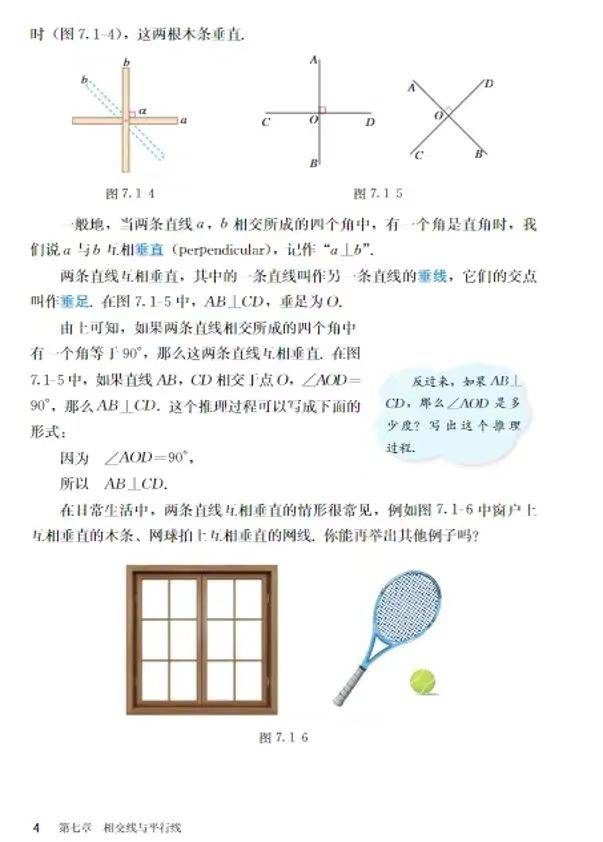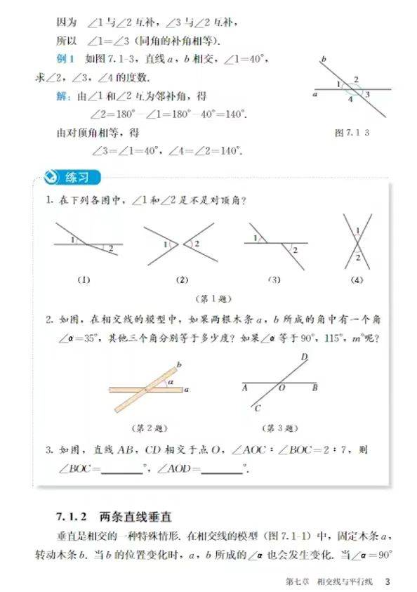 内容主要涵盖两方面核心知识:两条直线相交的基本概念与性质,包括邻补角的定义、两角之和为 180° 的数量关系,对顶角的定义及相等的性质,同时通过具体例题展示知识点的应用;两条直线垂直的相关内容,明确垂直是相交的特殊情形,给出垂直的定义、表示方法,推导得出垂直的双向推理逻辑,并用生活实例辅助理解。