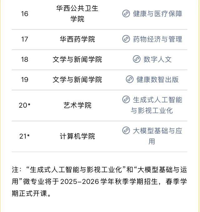 在四川,多所高校已将微专业建设提上日程。以四川大学为例,2025-2026学年秋季学期共有19个微专业拟开课,涉及经济学、文学、理学、工学、医学等学科门类。