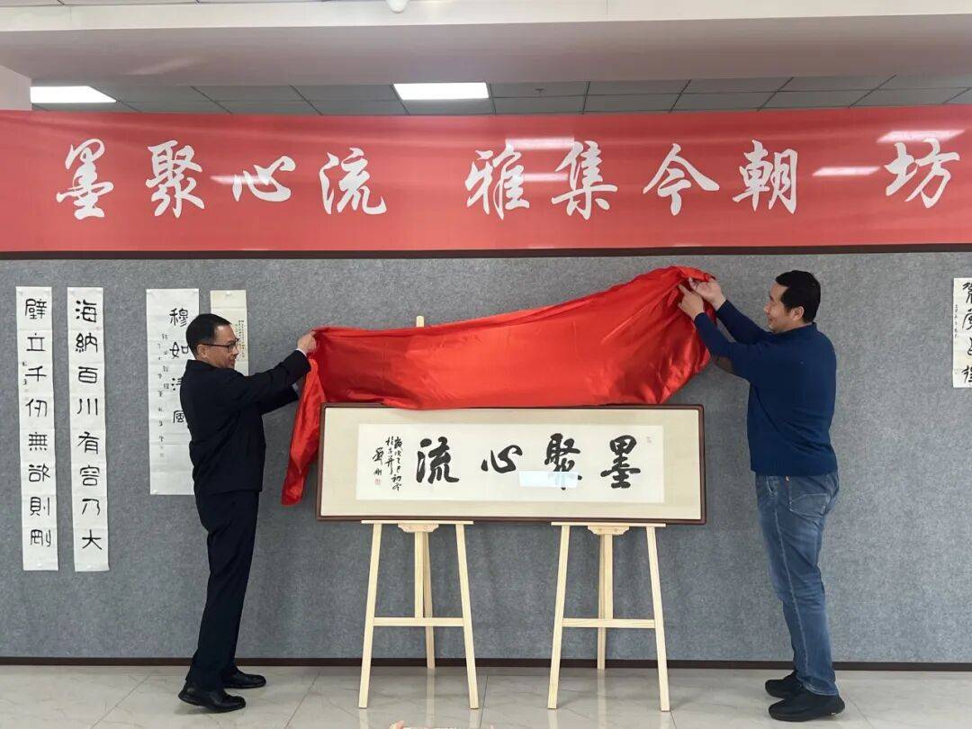在现场师生的共同见证下,董兆军与肖志超共同为“墨聚心流书画坊”揭牌。这一揭牌不仅是物理空间的启用,更是我校文化育人阵地的新拓展,标志着图书馆与工会在协同服务师生心理健康、营造校园文化方面迈出了坚实步伐。揭牌仪式后,全体与会人员合影留念。