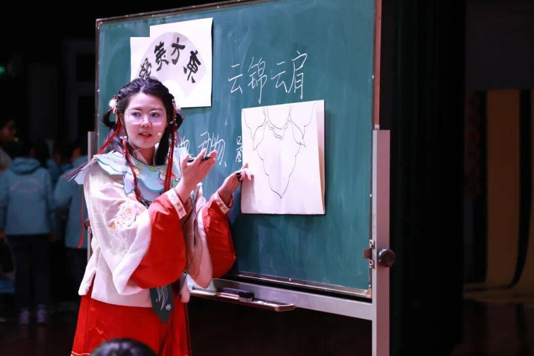 杜沐阳老师开设了《东方美学——云锦云肩》展示课。她带领学生用画笔设计属于自己的“云肩”。金陵十二钗的服饰,从黛玉的素雅到宝钗的端庄,一针一线藏着东方美学的密码。云肩不只为美,更承载着祝福与身份。这节课,让传统工艺在现代课堂焕发新生机。