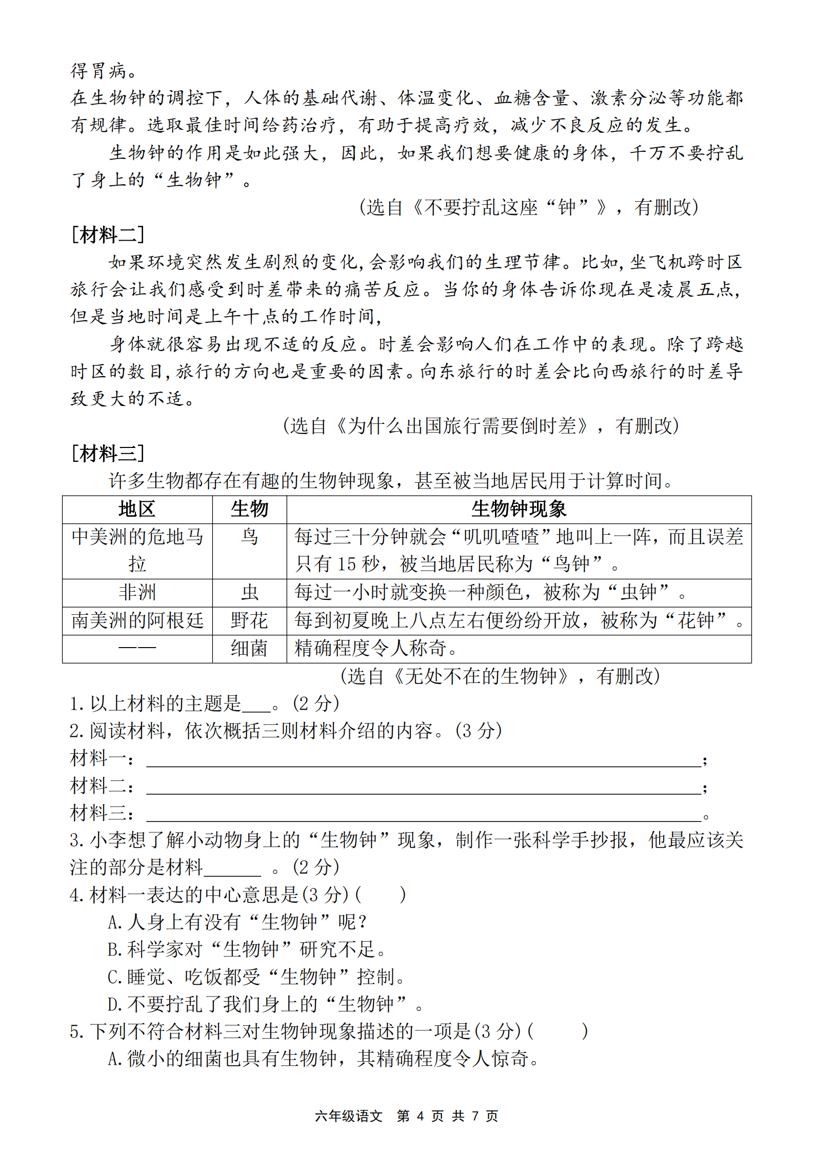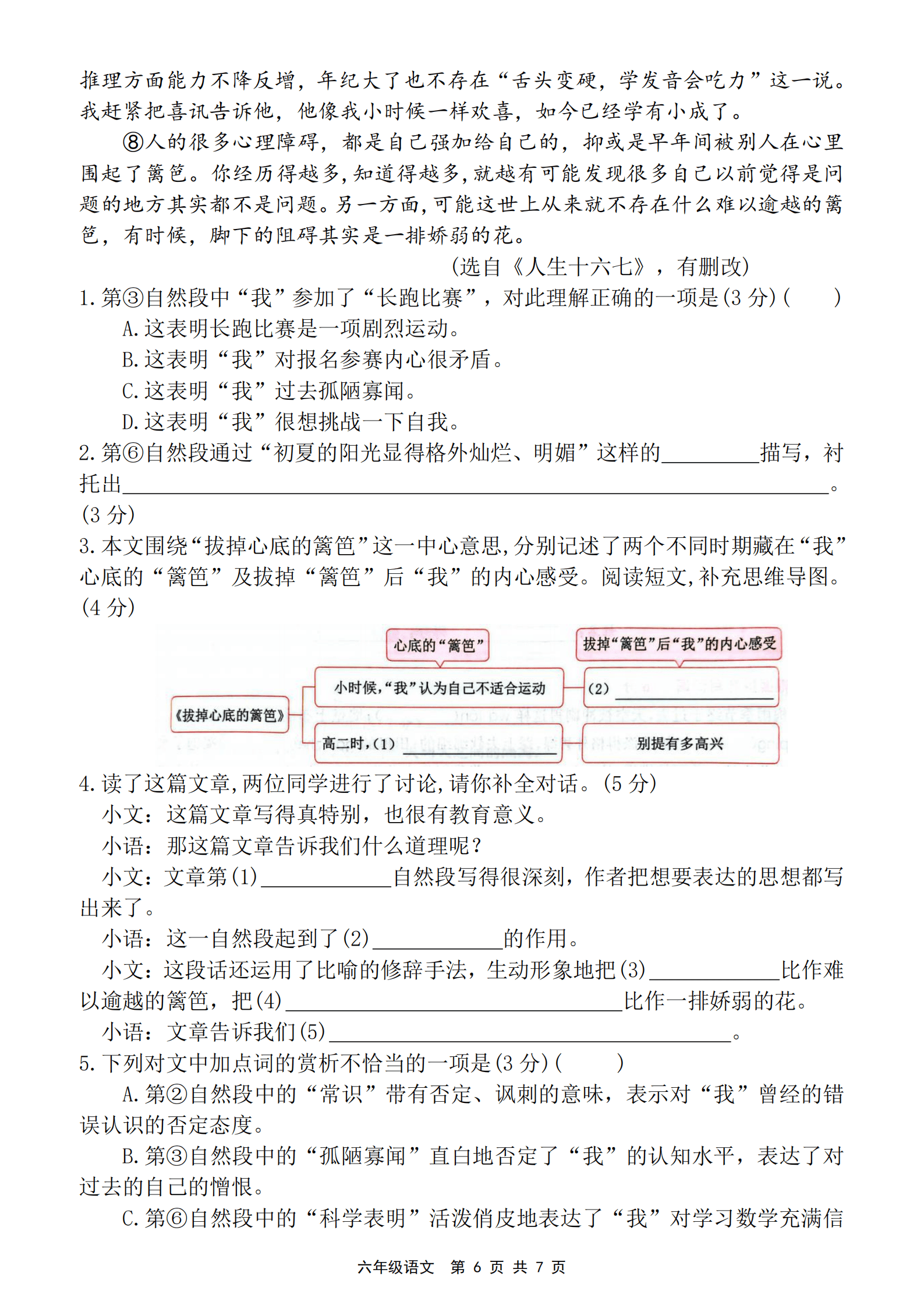 试卷覆盖了六年级语文的核心能力点:拼音写词、字音辨析等基础题巩固字词积累;句式结构、病句修改等题型强化语法运用;阅读题则考查文本理解、信息提取与赏析能力;习作题训练叙事与情感表达。全卷从 “基础积累” 到 “综合运用” 的分层设计,能帮助学生系统性夯实六年级语文的核心素养。