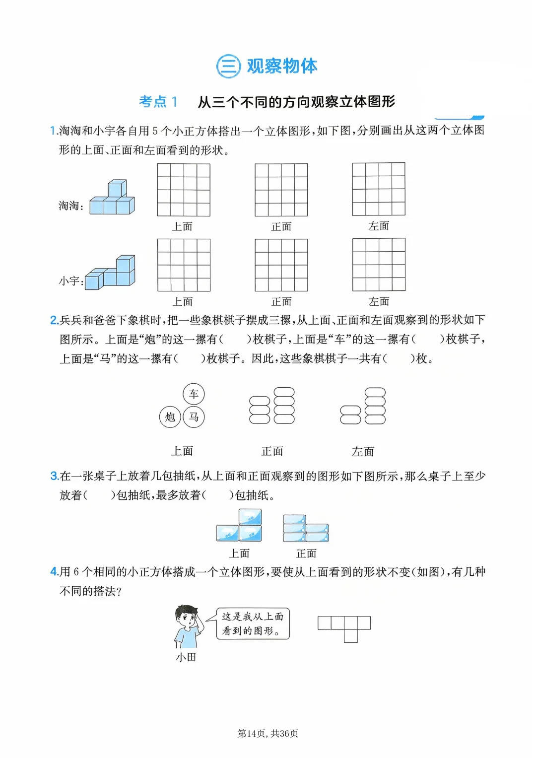 最后是能力培养踩准六年级 “应试 + 思维” 的双目标—— 六年级既要 “搞定期末 / 升学考”,也要 “提升数学思维”,这份练习里的 “圆的周长计算、观察物体” 能帮学生守住基础分;“列方程解百分数” 训练 “建模、逻辑推导” 的核心能力;而 “不同位置观察物体” 还能培养空间想象能力,完全契合六年级 “应试提分 + 思维进阶” 双提升的需求。
