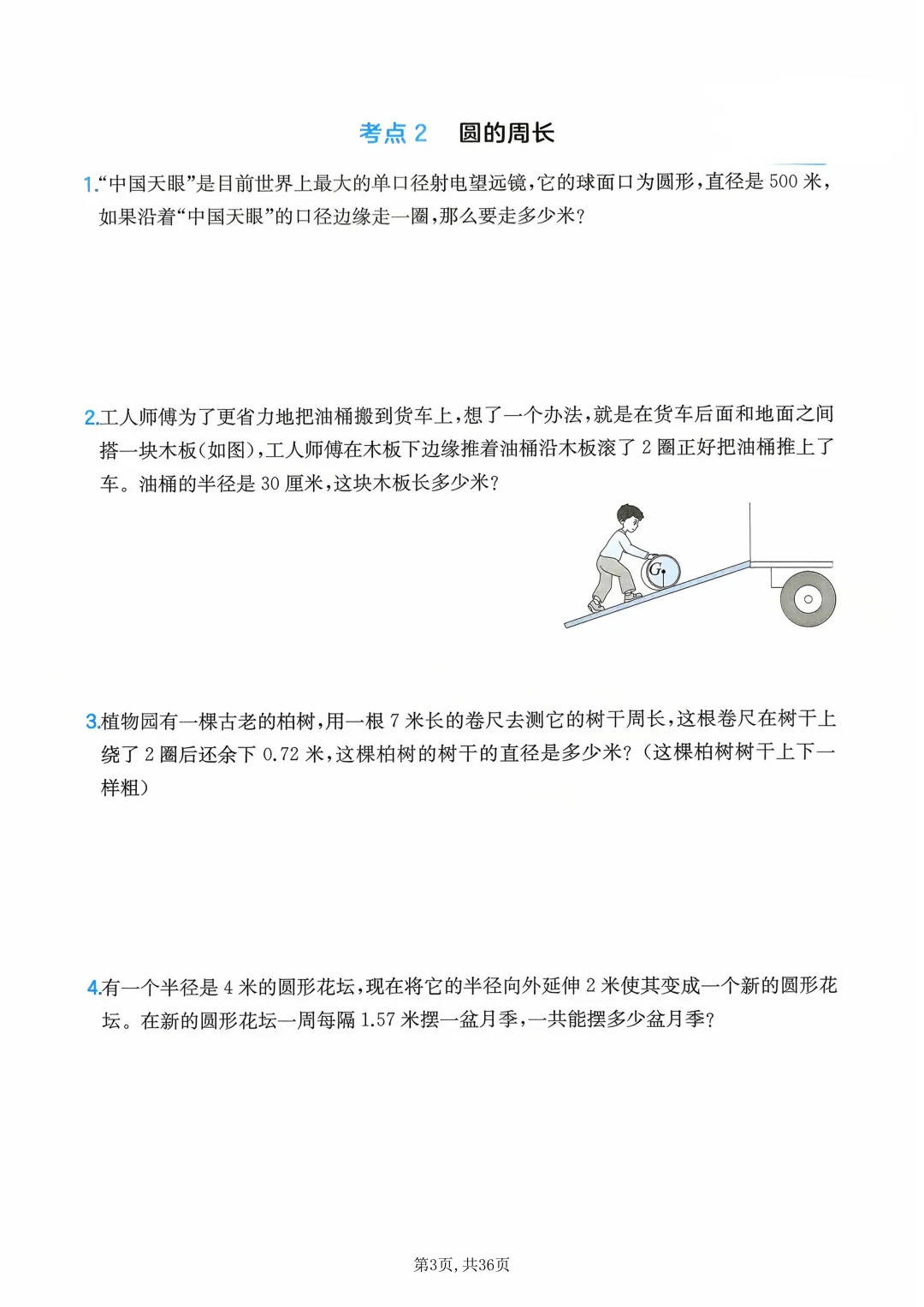 首先是适配六年级 “知识整合 + 应用升级” 的核心需求—— 六年级是数学从 “单一知识点” 向 “综合应用” 过渡的关键期,这份练习把 “圆的周长公式” 用 “中国天眼、油桶滚木板” 的生活场景包装,既贴合六年级 “用公式解决实际问题” 的节奏;又通过 “列方程解百分数”“观察物体相对位置” 训练综合思维,为小升初的复杂应用题打基础。
