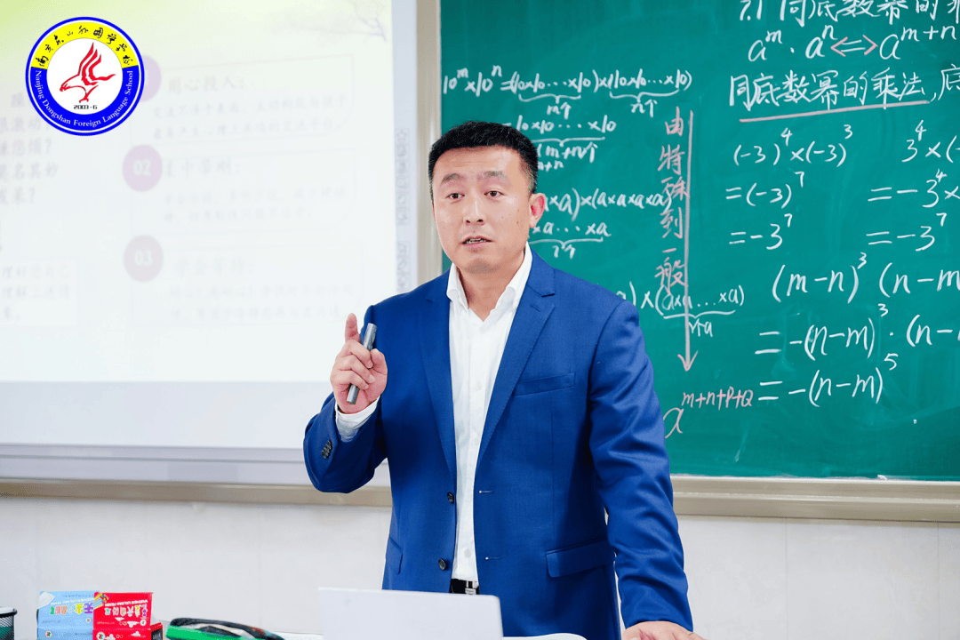 “老师讲得太好了,我当年没学好的‘幂的运算’,竟然在儿子的课上听懂了!”一位爸爸上完夏宗斌老师的数学课,惊叹不已。“小学数学更多是计算,而初中数学进入代数和几何阶段,对思维的要求更高。”夏老师这节课讲授“同底数幂的乘法”,他带着全班同学从分析到辨析,再到例题研究,进行了一场“推理大赛”。“我尽量多设计问题,用问题驱动学生思考,增强互动,让他们一环接一环推进,学会数学的方法,培养观察、综合、类比、归纳、抽象、概括等思维能力。”