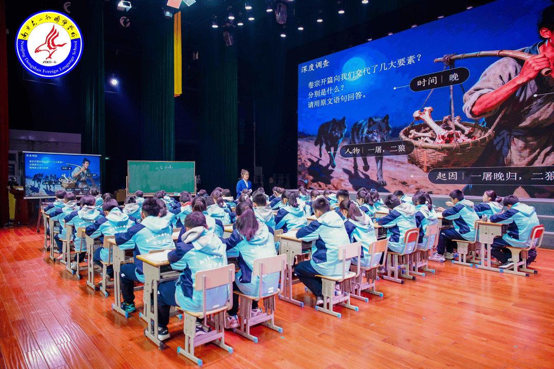 “同学们,欢迎来到学校近期打造的‘人与动物’主题文化长廊!在这里,有一个特别的区域正等待着我们——那就是蒲松龄《狼》文化体验区。”孙昕姣老师的语文课,刚开始就抛出了一个有趣的情境,牢牢吸引了同学们。孙老师向大家展示利用AI生成的生动图片,趁热打铁发布本节课三个闯关任务:“我是情节讲述者”“我是故事重构师”“我是感悟分享员”。整节课,同学们不断被项目任务驱动,卷入思考,小组讨论热烈,举手发言积极,纷纷发表自己的见解。