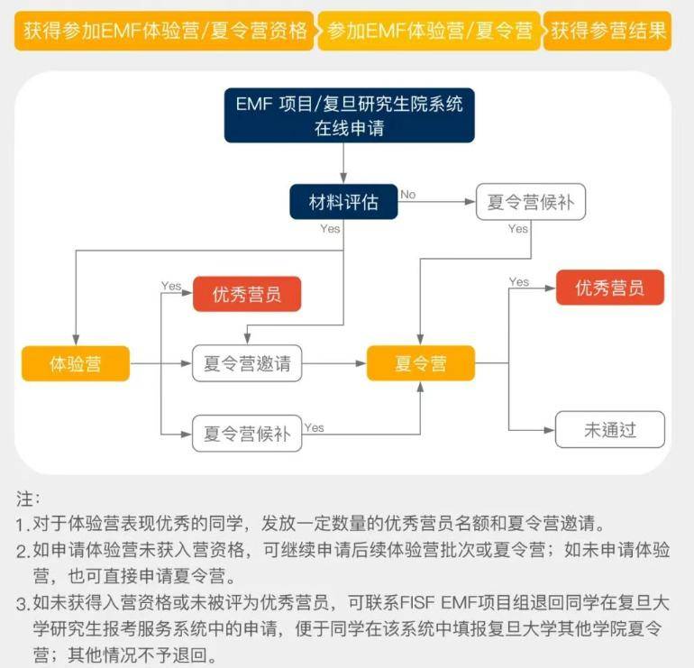 ◉2026级推免招生安排:今年复旦大学泛海国际金融学院推荐免试招仅包括夏令营一种形式。FISF EMF项目于2024年3月-2024年8月举办体验营及夏令营系列招生推广活动并作为EMF项目考察推荐免试研究生的主要方式。具体流程如下: