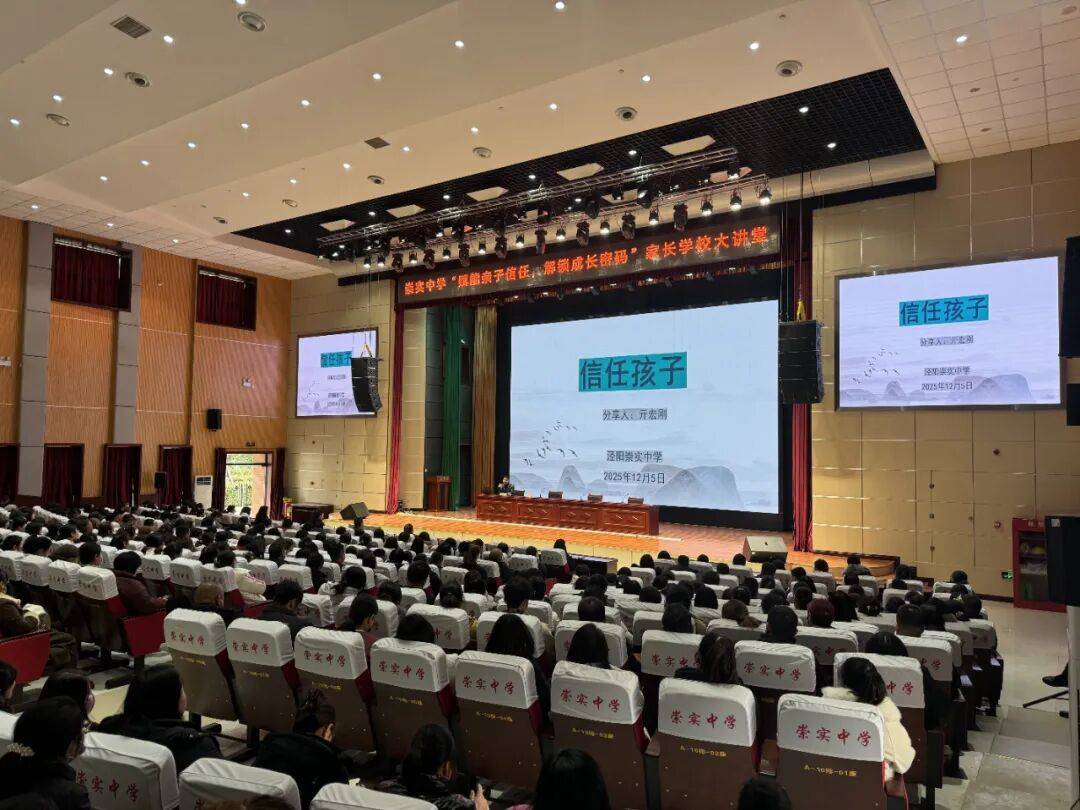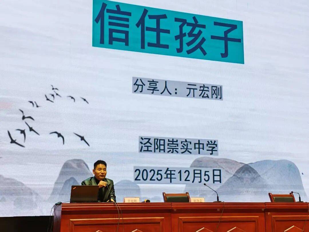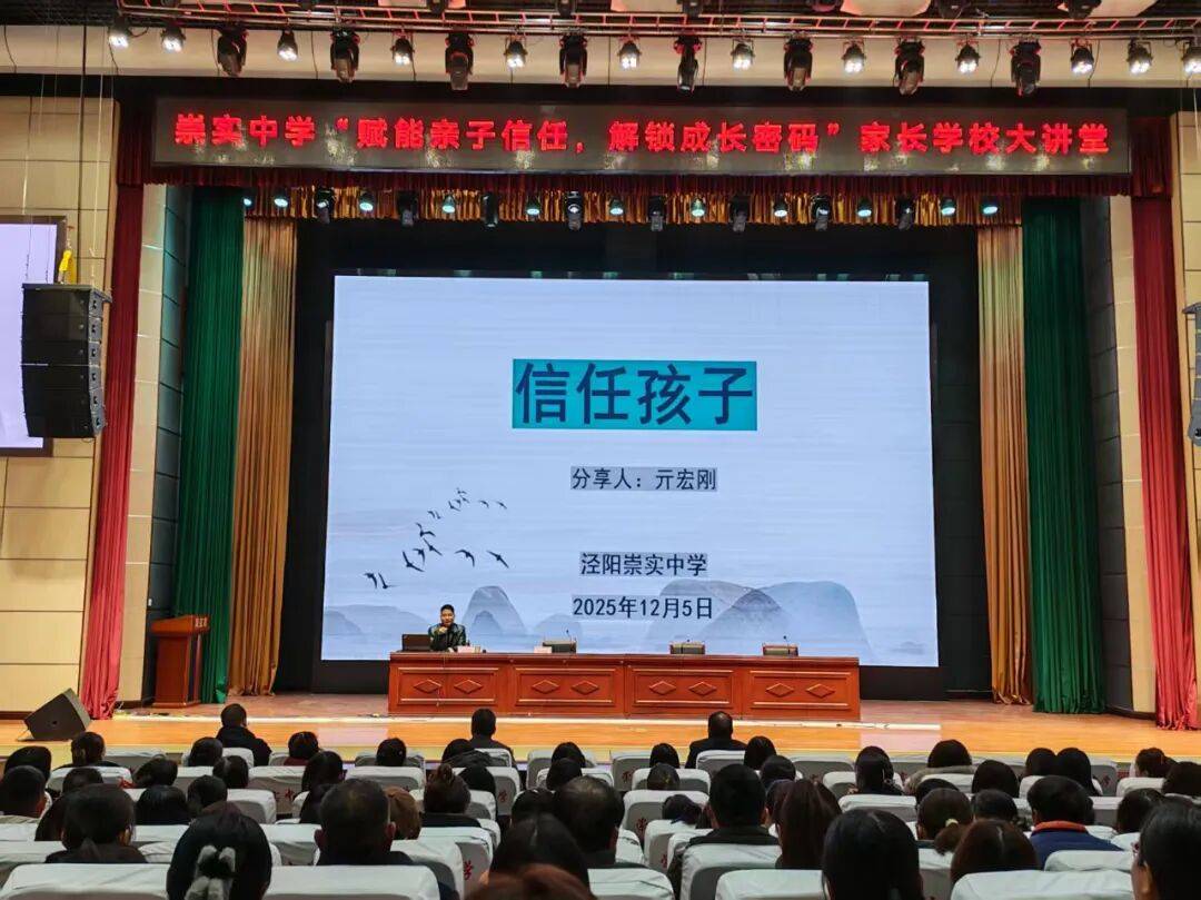 2025年12月5日下午,陕西泾阳县崇实中学报告厅座无虚席。作家、书法家、教育专家亓宏刚受邀为该校初一、初二年级700多名家长带来了一场主题为《信任孩子》的家庭教育专题讲座。现场气氛热烈,互动频频,众多家长认真聆听并记录要点。