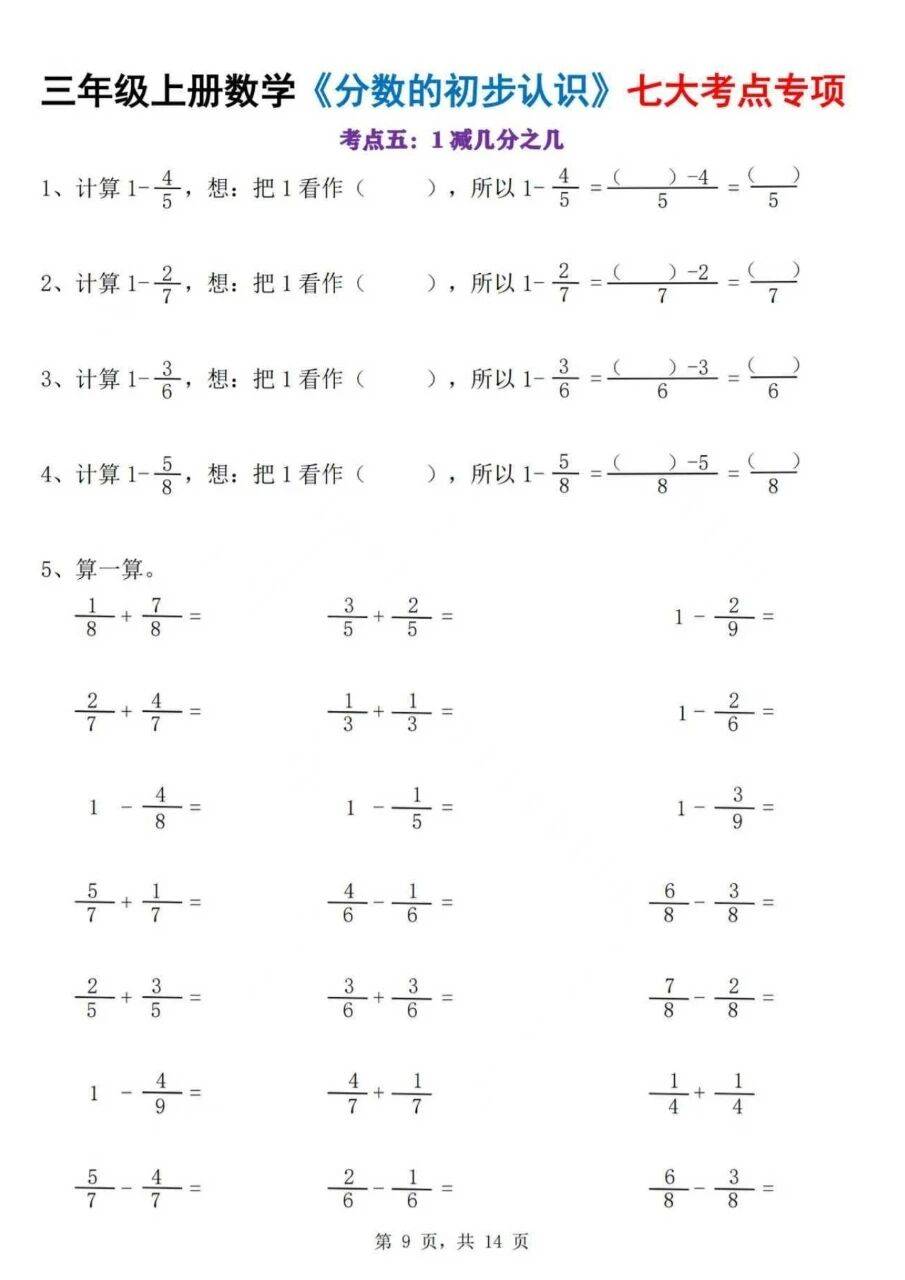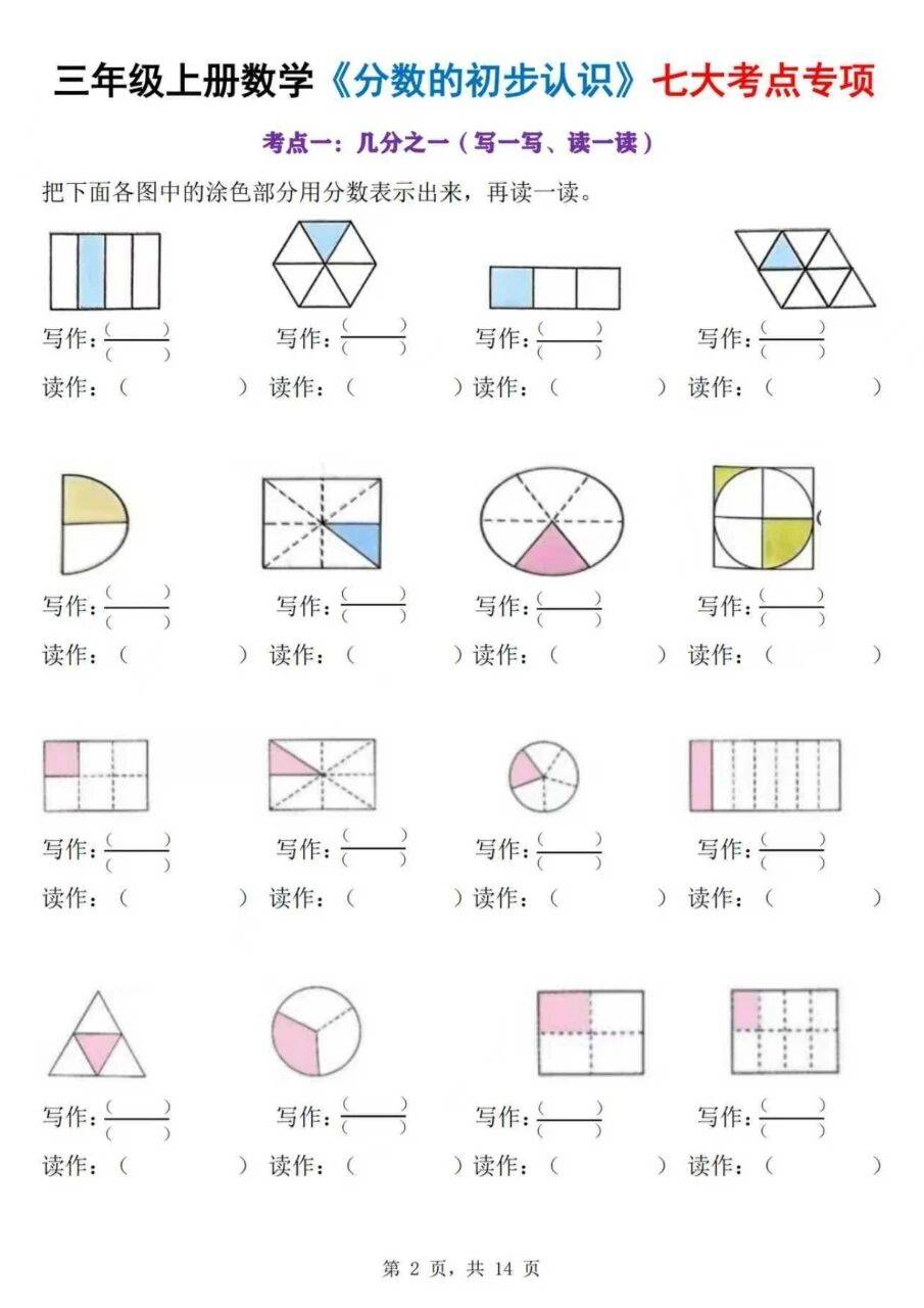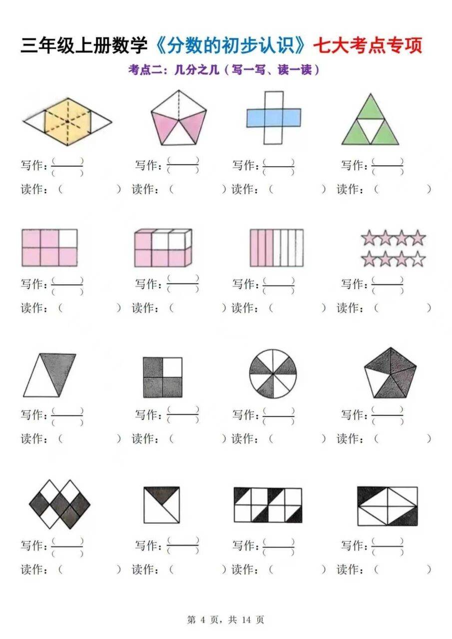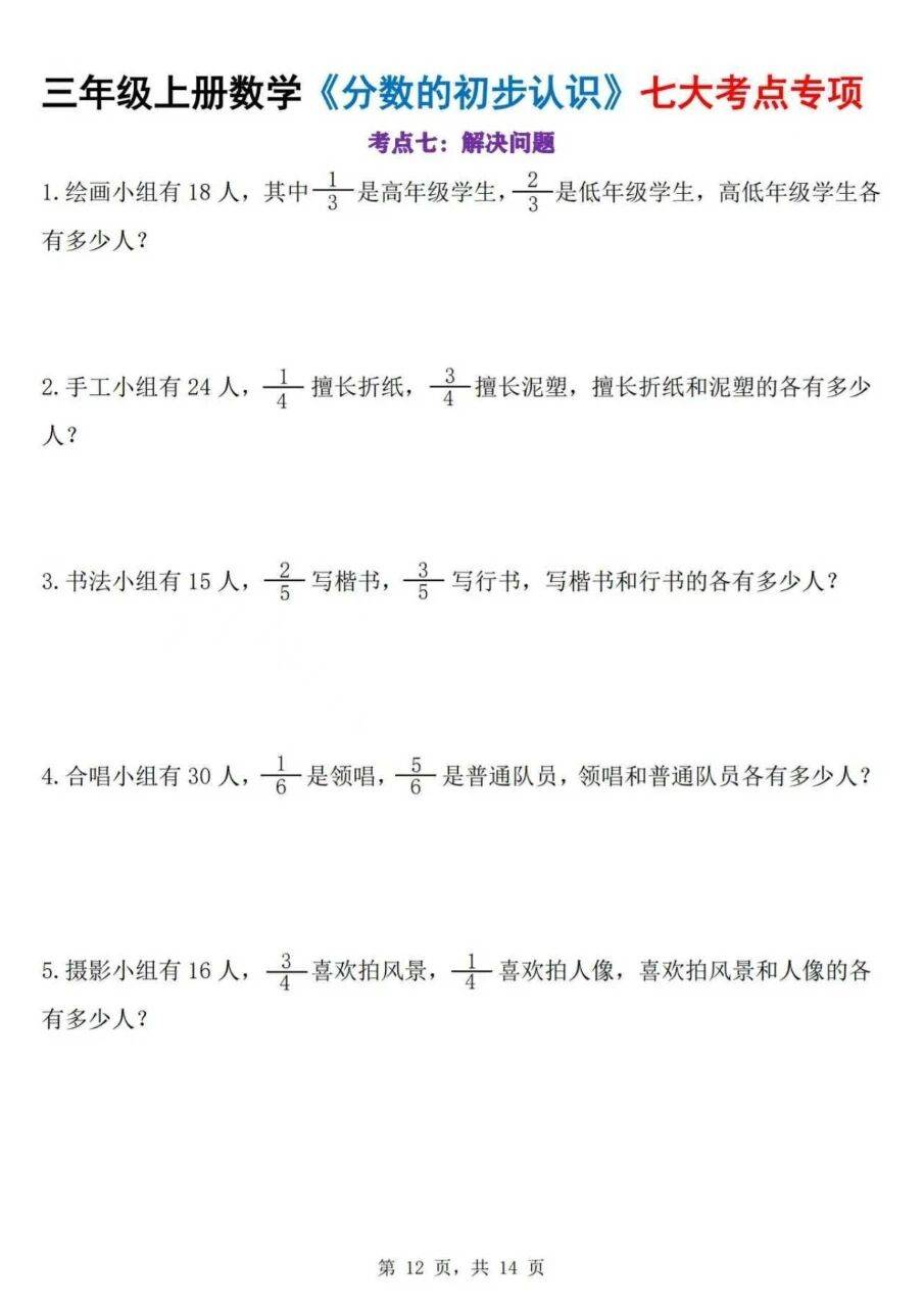 对于刚接触分数的三年级学生来说,这类专项练习的价值在于针对性强:每个考点都对应了课堂学习的核心内容,通过重复但不重复形式的练习,让学生在不同情境中巩固同一知识点,避免了概念混淆。比如 “几分之一” 的练习,用不同物体做载体,能让学生意识到分数的本质是 “分的份数与取的份数的关系”,而非物体本身;而解决问题部分,则是知识的综合运用,能检验学生是否真的理解了分数的实际意义。这样的练习既能帮助学生夯实基础,也能让他们在练习中逐步熟悉分数的运用逻辑,是课堂学习的有效补充,能切实提升学生对分数初步认识的掌握程度。