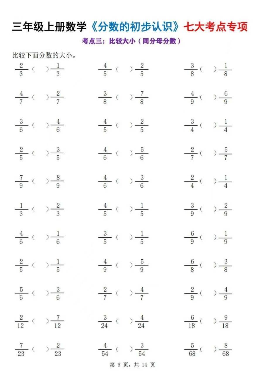 这些内容对学生的学习帮助是循序渐进的:从基础概念入手,先让学生理解分数 “平均分” 的本质,再通过读写练习强化符号与图形的对应,后续的比较和计算则提升运算能力,最后的解决问题环节,能让学生把抽象的分数概念和实际生活联系起来,既巩固了知识,也培养了用数学解决实际问题的意识。整体练习覆盖了分数初步认识的核心技能,符合三年级学生的认知节奏,能帮助学生逐步构建分数的知识框架,为后续更复杂的分数学习打下基础。