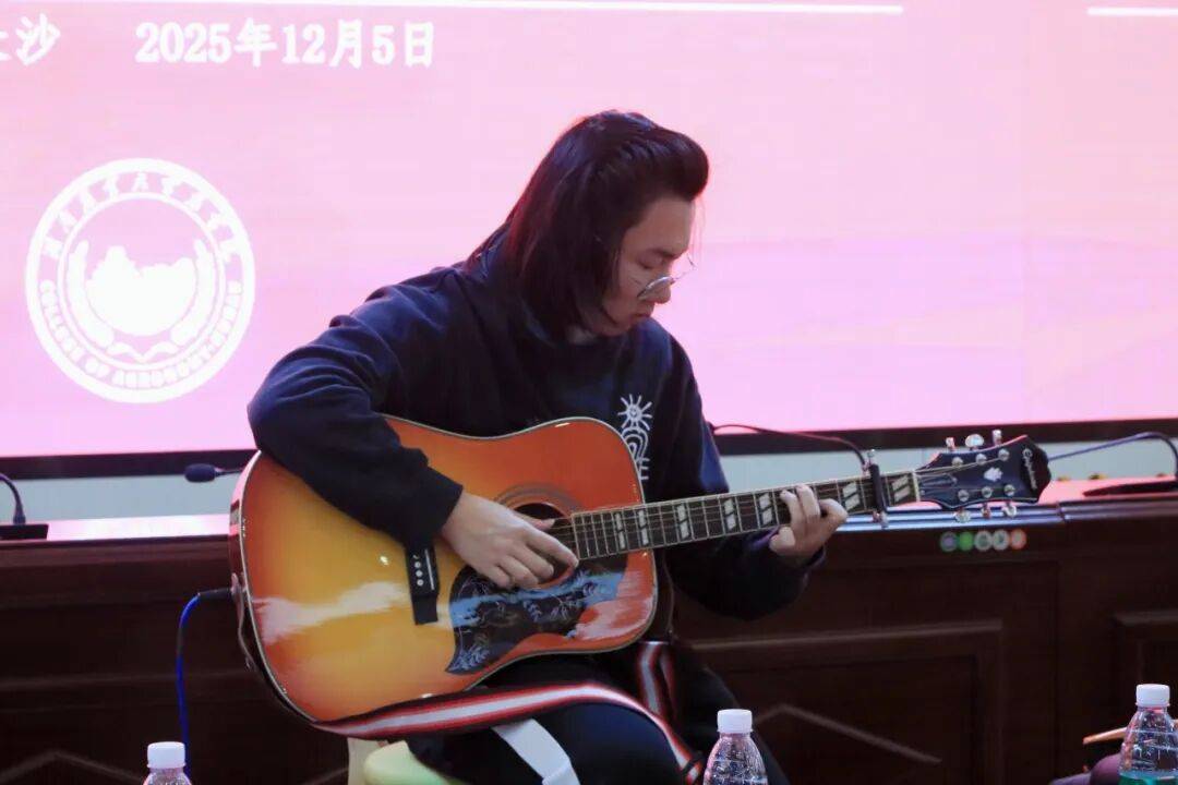 首先,由农学院艺术团器乐队与声乐队带来暖场表演:李政庭以吉他弹唱的形式演绎《等风来》,舒缓的旋律与温柔的弹唱,为冲刺阶段的考研学子抚平焦虑、传递从容;声乐队以一首充满青春热忱的《冲动》点燃现场氛围,唱出了考研学子为梦想全力以赴的热血与执着!