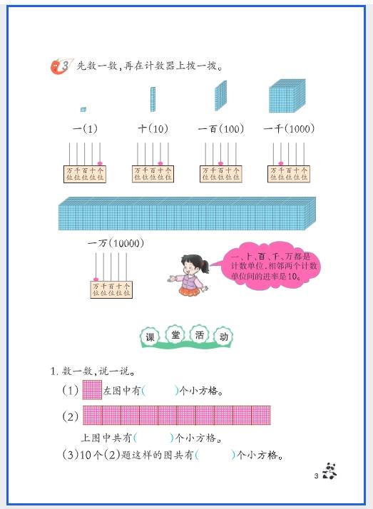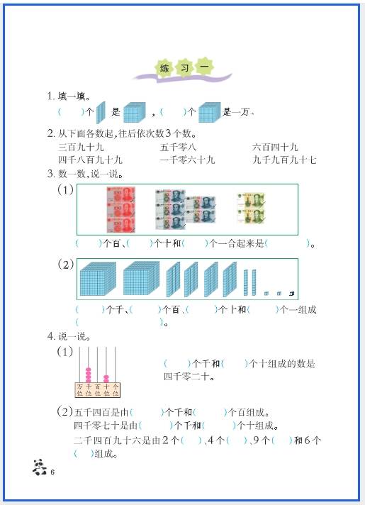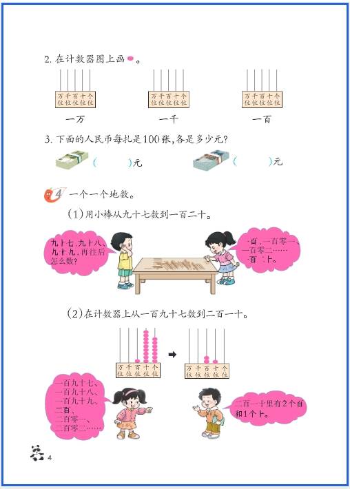 - 生活中的大数寻宝:找生活中的万以内数(如电梯楼层、商品价格、书本页码),让孩子写下来并读给家长听,比如 “冰箱价格是 2999 元,读作二千九百九十九”。