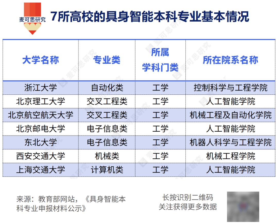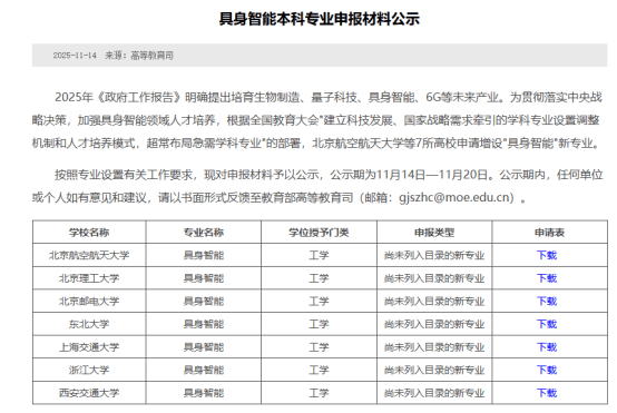 近日,教育部网站发布《具身智能本科专业申报材料公示》,北京航空航天大学、北京理工大学、北京邮电大学、东北大学、上海交通大学、浙江大学、西安交通大学等7所“双一流”高校申请增设“具身智能”新专业。
