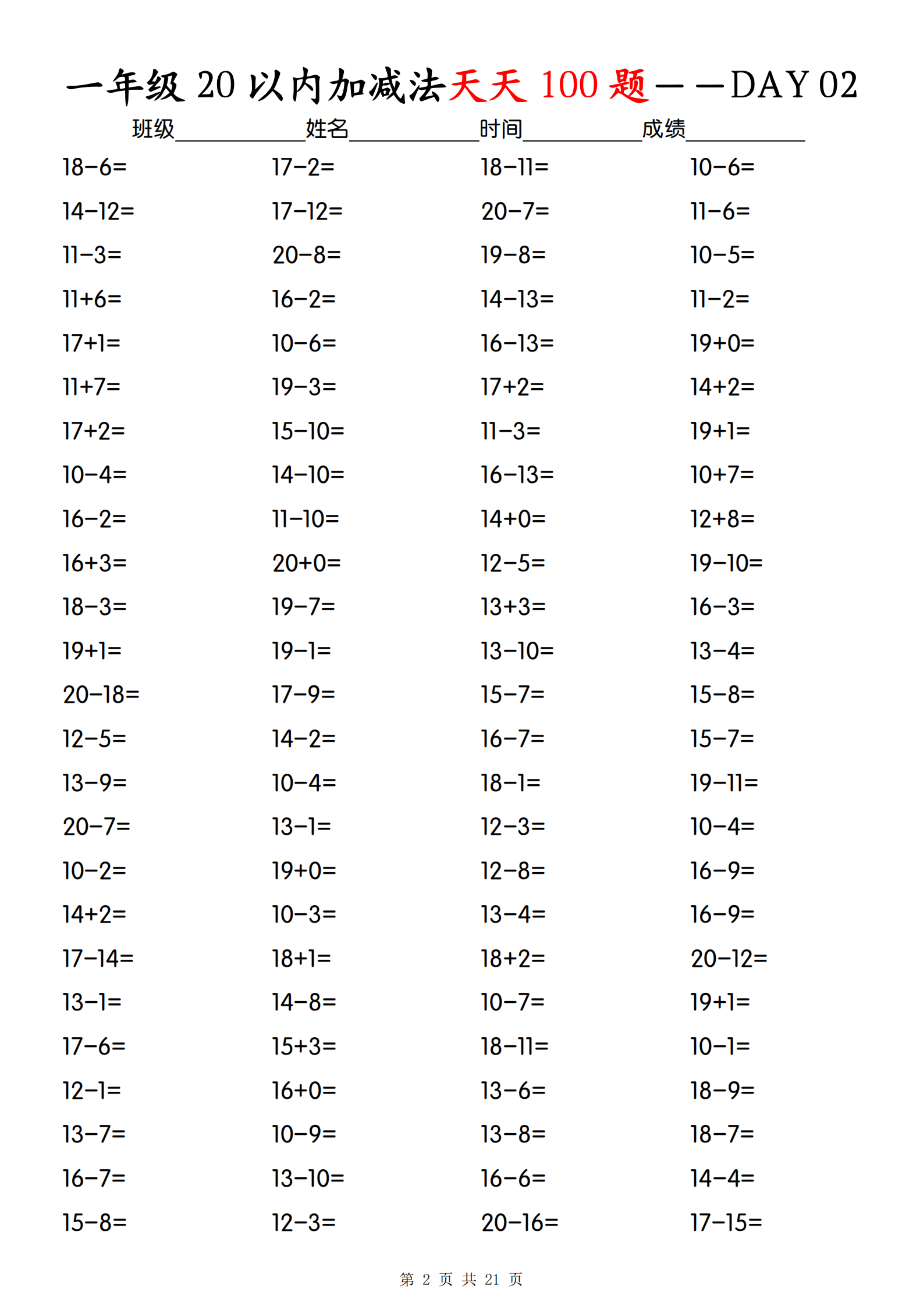 练习的题量和难度很适配:每天 100 题覆盖 “凑十法”“破十法” 对应的加减组合,比如 12-7、16-9 这类易错题反复出现,练多了自然能熟练运用算法。做题时可以计时,既能训练反应速度,也能通过 “时间 + 正确率” 的记录看到进步。这类练习的关键是 “坚持每日练”—— 不用花太长时间,10 分钟就能完成 100 题,既能夯实 20 以内加减法的基础,又能为后续 100 以内加减法打牢计算能力。