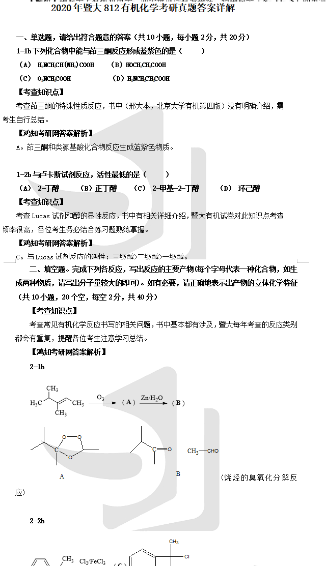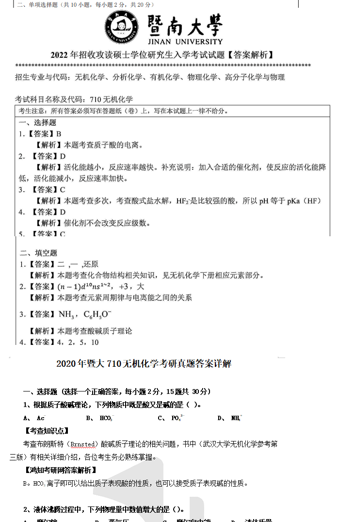暨大化学与材料学院:无机化学、分析化学、有机化学、物理化学、高分子化学与物理A:真题试卷答案部分: