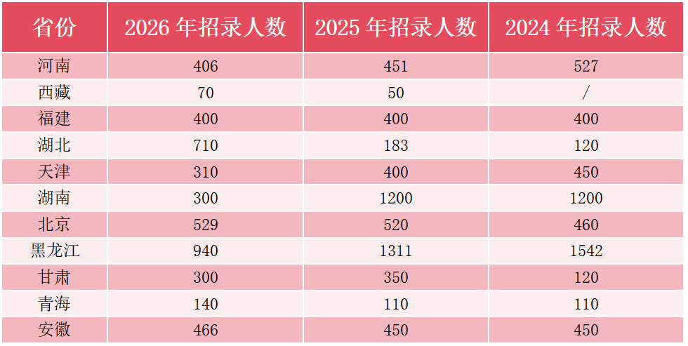 ☆黑龙江:延续缩招势头,从2024年的1542人降至2026年的940人,三年累计减少超过600个名额。