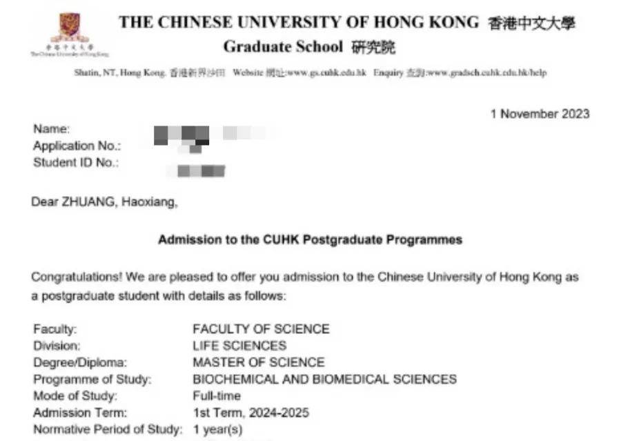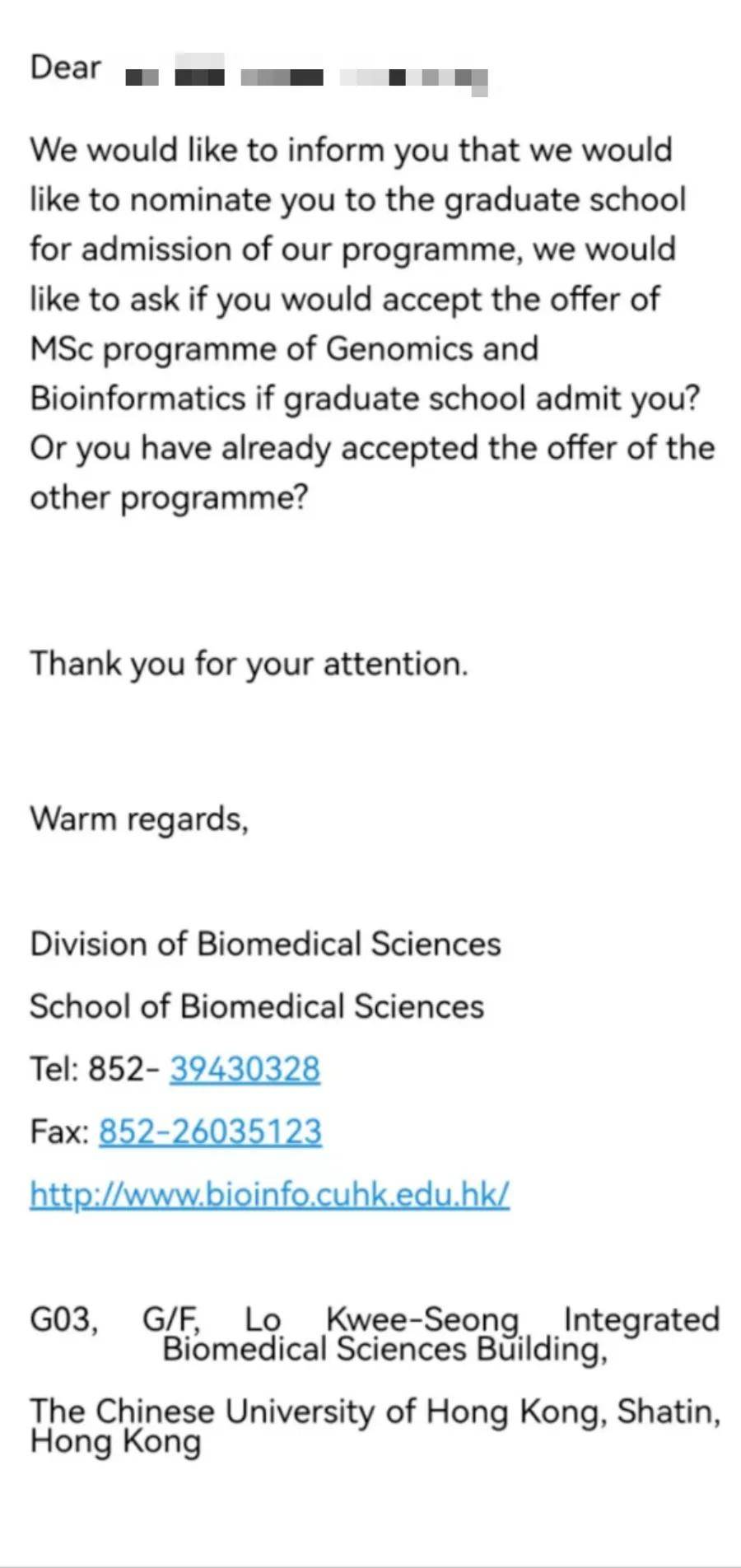 从11月开始,我陆陆续续收到了很多offer。在11月1日,我最先收到了香港中文大学的生物化学与生物医学的offer,本来已经挺满意的,申请时悬着的一颗心终于放下了。
