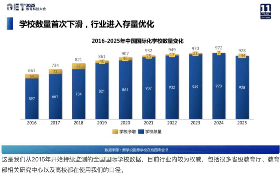 2、侠义数据(928所):仅指经教育主管部门审批、具备颁发学历资格的合规国际学校。这个数据2025年首次出现负增长,新建校数量跌至个位数,可以说明国际学校行业越来越少资本进入。