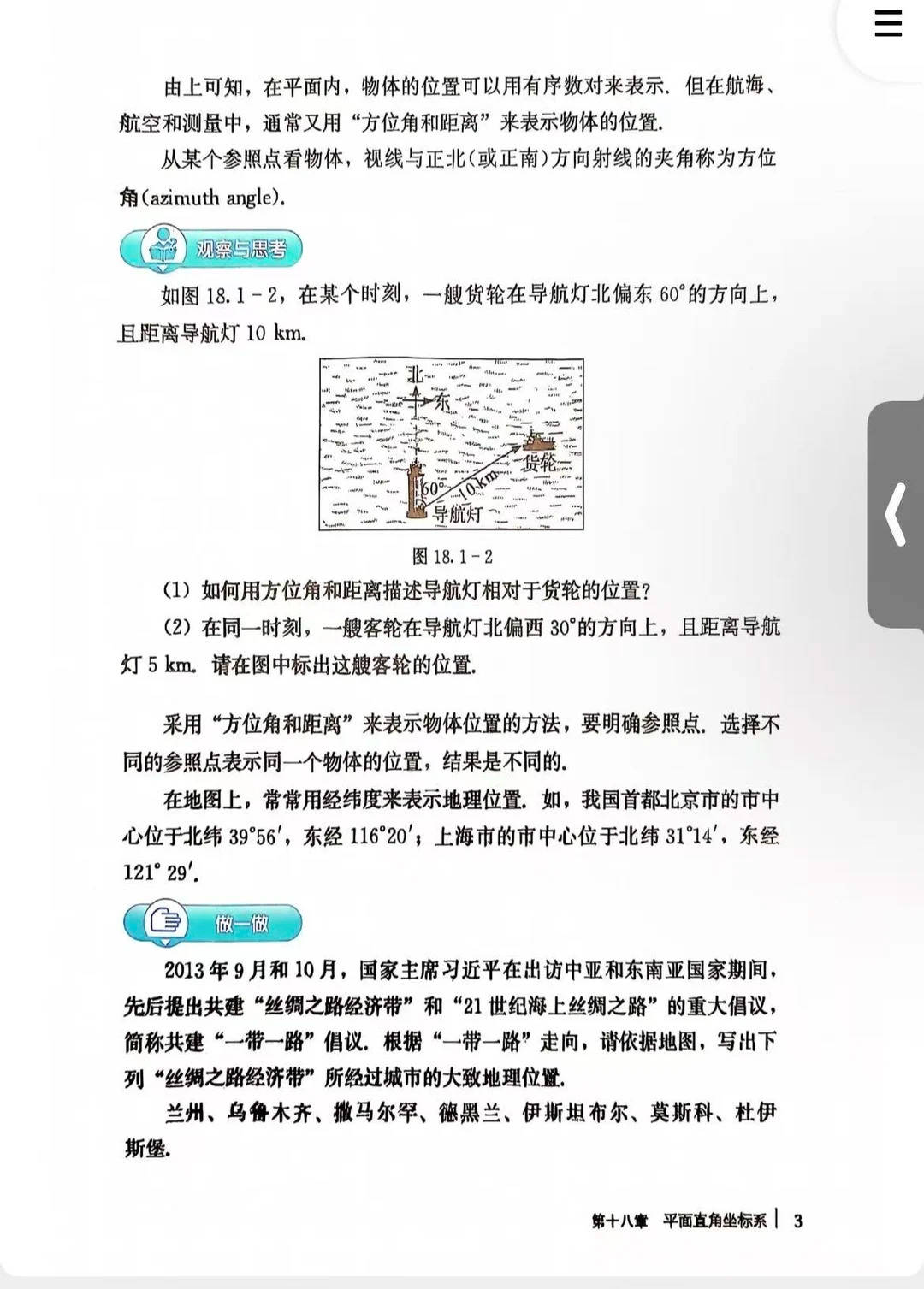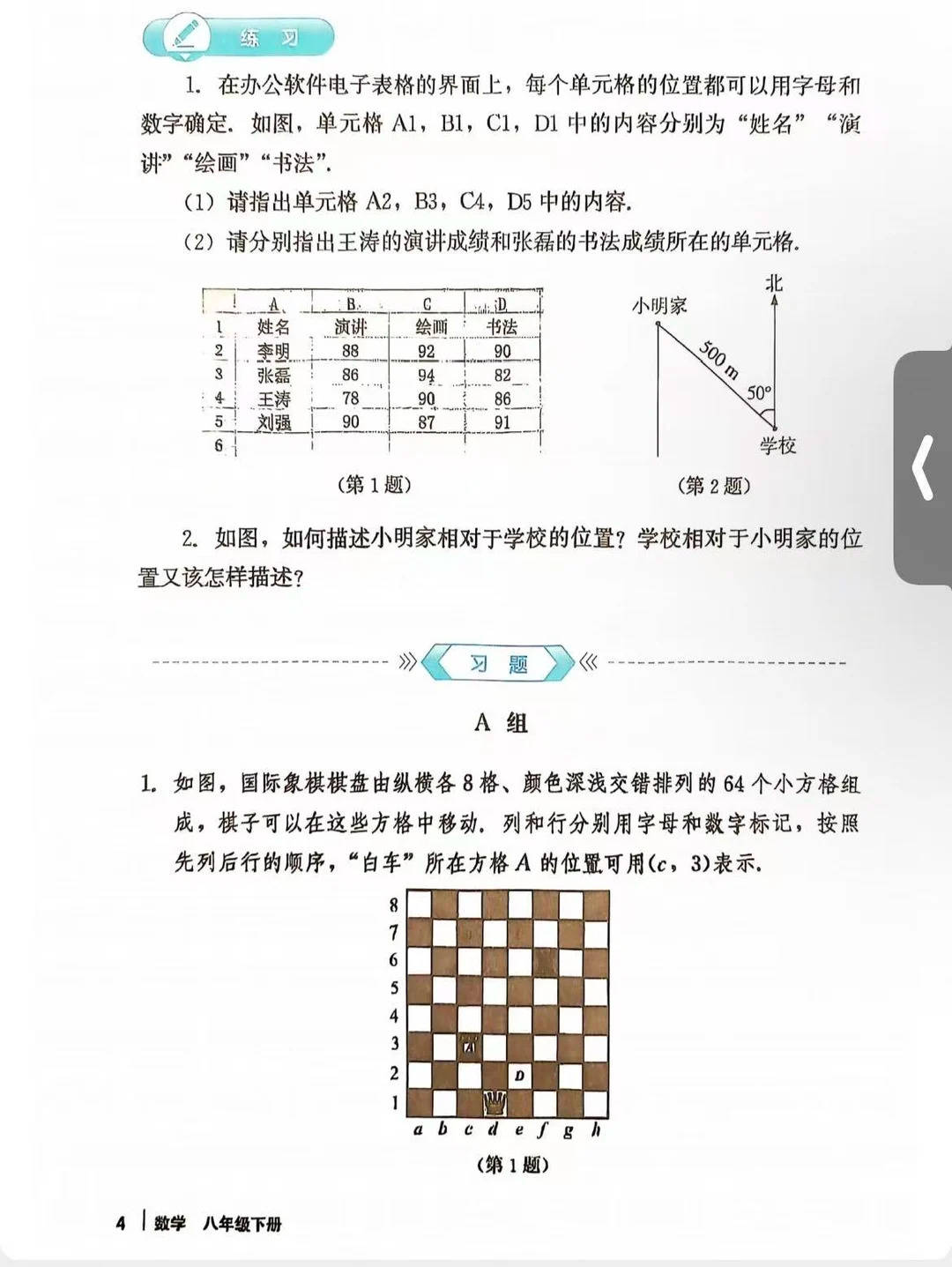 八年级下册数学教材也太懂几何与代数衔接了!这是 “知识体系 + 生活应用” 的实用课本,涵盖平面直角坐标系(位置确定、有序数对)、函数、一次函数、四边形、数据整理等全册核心模块,连 “有序数对定位、方位角 + 距离描述位置” 这类几何代数结合考点都配了生活场景(教室座位、象棋棋盘),从概念理解到综合应用一站式覆盖!