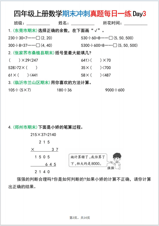 - 练乘除法笔算:聚焦 “三位数乘两位数的进位乘法”“除数是两位数的试商与调商”,每道题附验算步骤提示,帮孩子养成 “算完就查” 的好习惯。