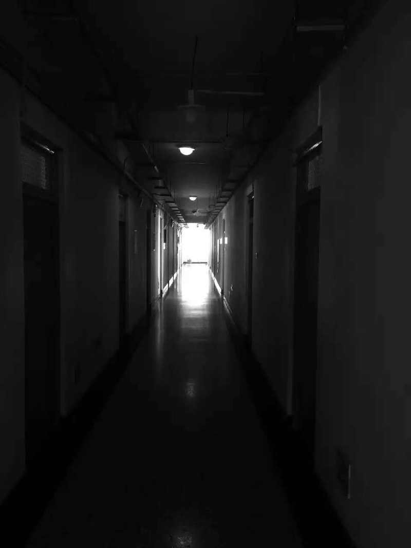 2016年1月期末考试后,小月在夜晚拍了一张宿舍楼道的照片。她觉得这象征着自己的内心世界,被黑暗充斥,不知道什么时候才能走到光明的地方。受访者供图