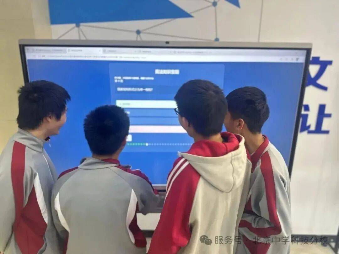 学校开展了“宪法之光 法润校园”系列宣传活动。学校聘请朝阳区人民法院院长刘海东为学校法治副校长,刘院长带来法治讲座,引导学生了解法律、遵守法律、运用法律。学生创作出知识竞赛、互动游戏等宪法宣传网页。网页在学校电子屏上展示,课间学生参与体验,让法律知识在互动中悄然入心。学校通过多元化、创新性的活动形式,让法治精神在校园中生根发芽。