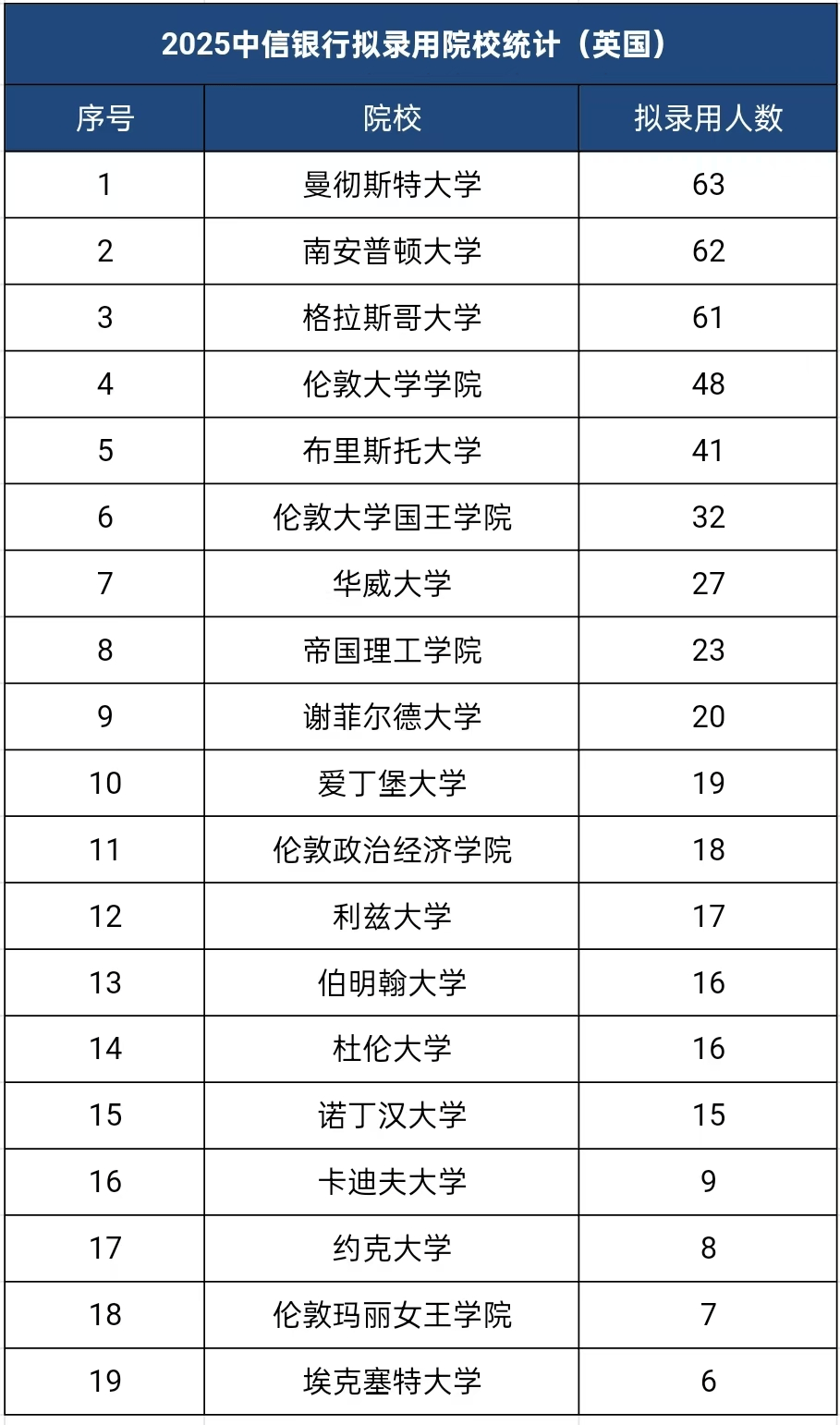 英国大学商科专业多、名声好,金融公司自然爱招。特别是英国课程设置跟中信银行这些金融机构的海外业务很对路,所以英国毕业生特别吃香很正常。