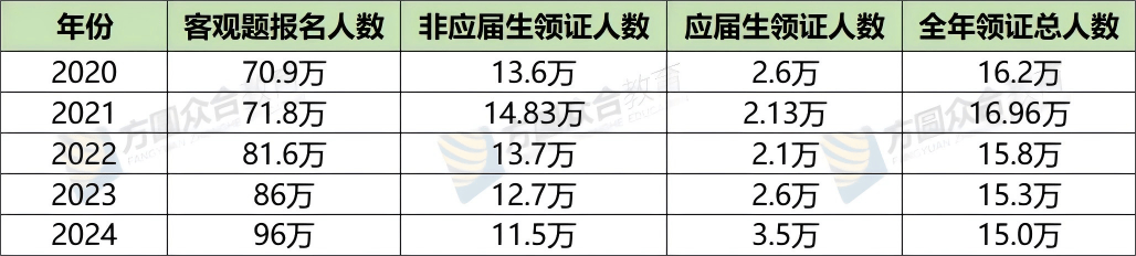 通过数据梳理我们不难看出,近些年,法考报名人数呈现增张态势,而法考总体通过人数却未同步增长,通过比例持续在下降,所以说拿证难度是有所提升的。