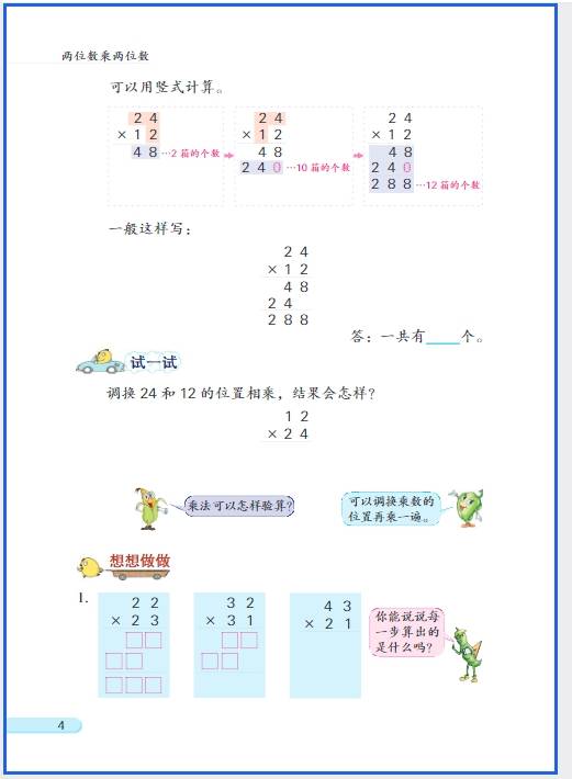 - 乘法分配律初步:针对多位数乘一位数的简便计算(如 \(12×5=(10+2)×5=10×5+2×5=60\);\(99×3=(100-1)×3=300-3=297\))。