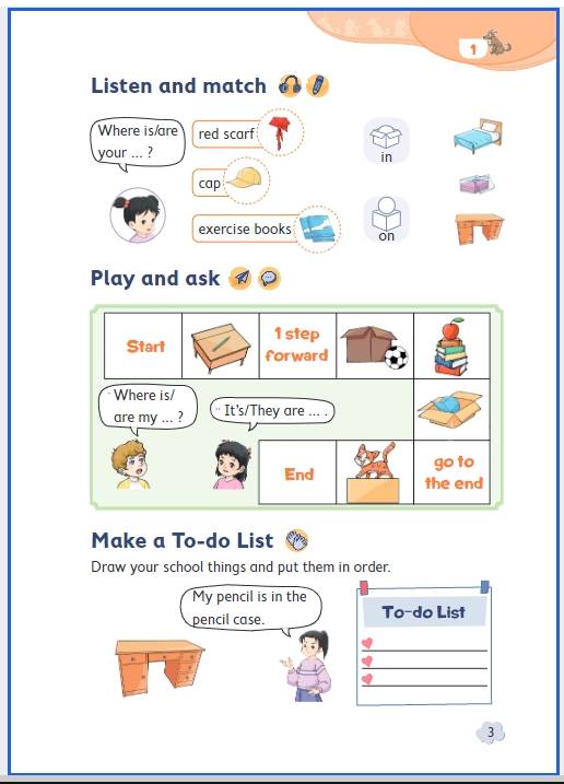 - 图文结合,直观记忆给单词配对应实物图或简笔画(如画苹果记 apple,画尺子记 ruler);记句型时结合动作(如说 “Stand up” 时起身,说 “Touch your eye” 时摸眼睛),强化记忆关联。