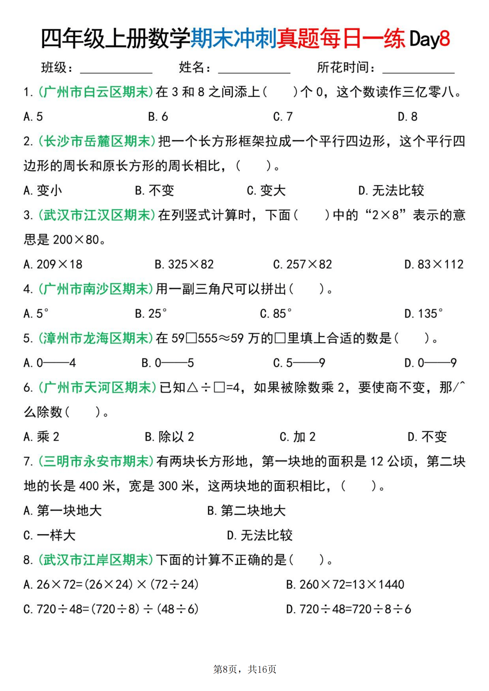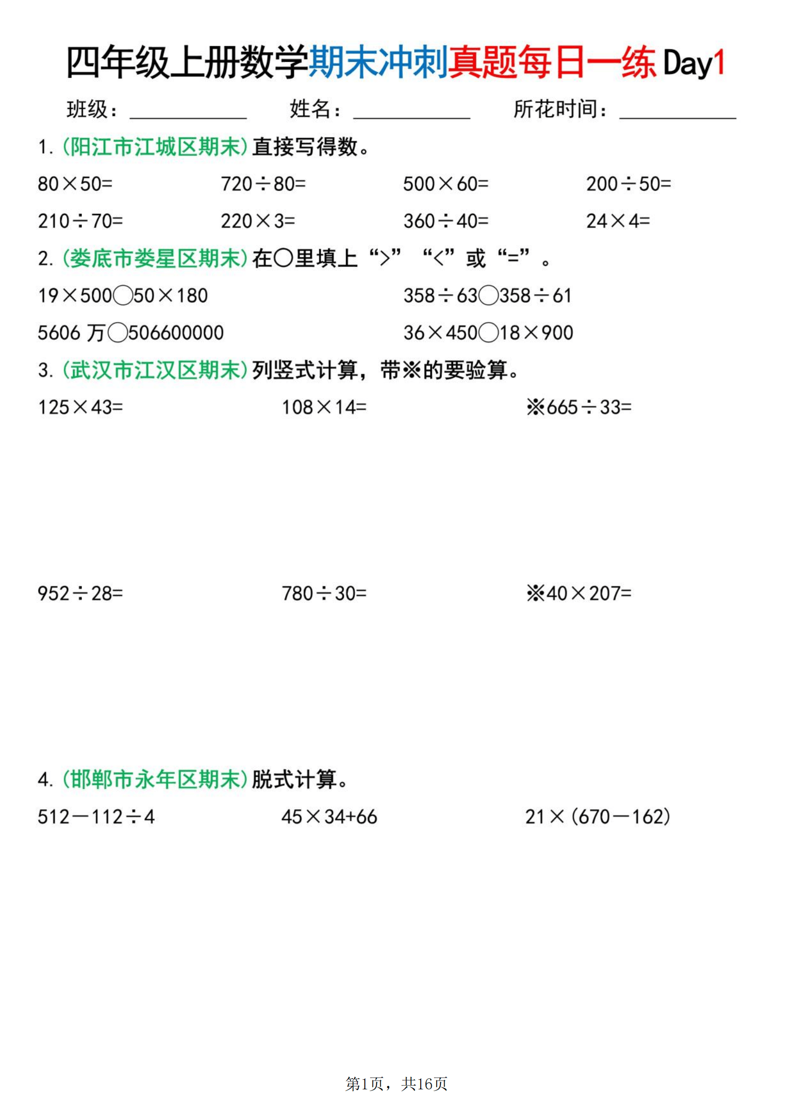 今天为大家分享:四年级上册数学期末复习冲刺真题每日一练14天(含答案)。聚焦四年级数学核心考点的真题训练,以各地期末真题为载体,精准覆盖四年级上册数学的核心知识模块,兼顾基础与进阶,在练习中全面梳理知识点,贴合四年级数学的知识体系,有效帮助学生系统提升数学能力。