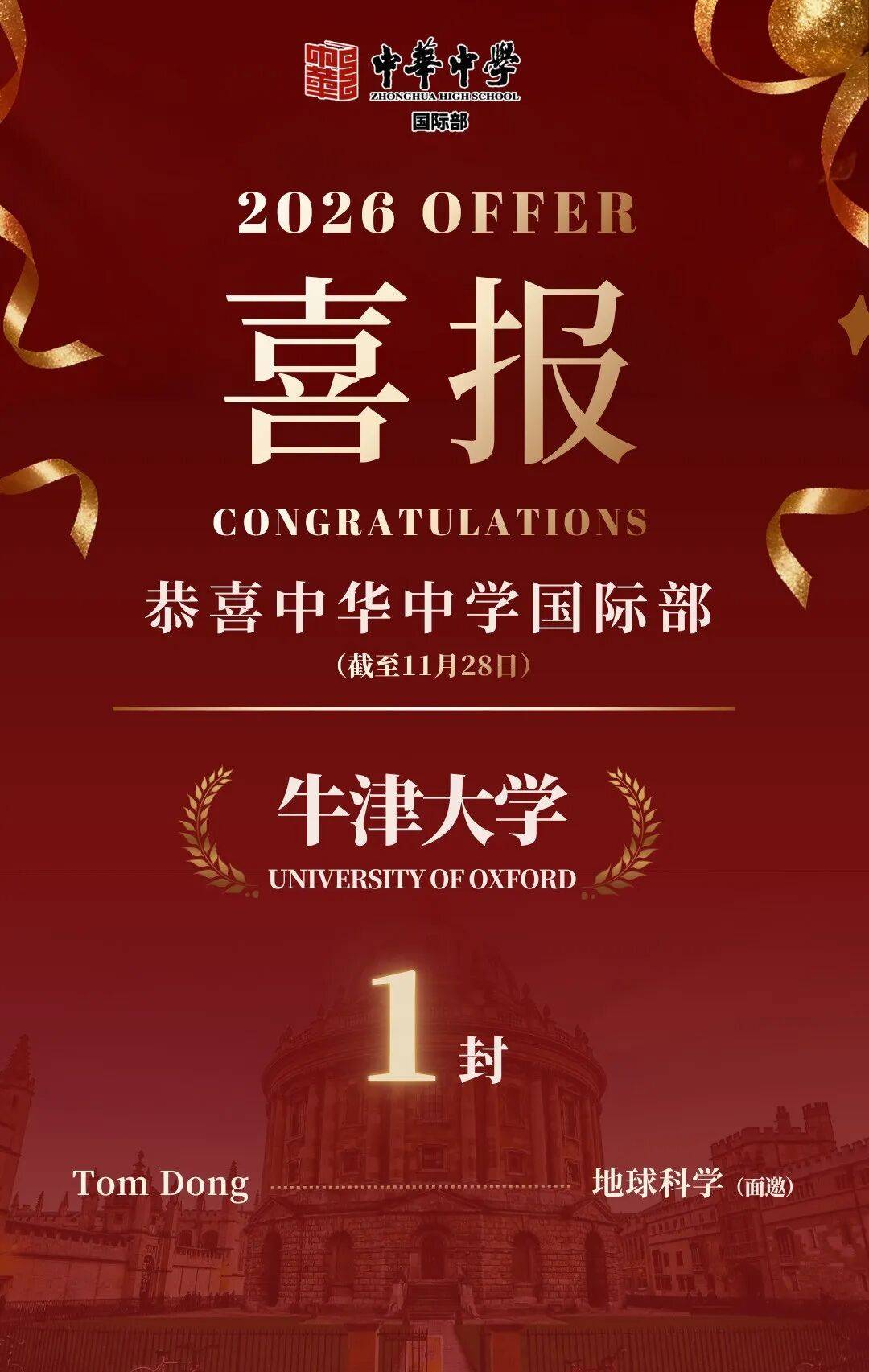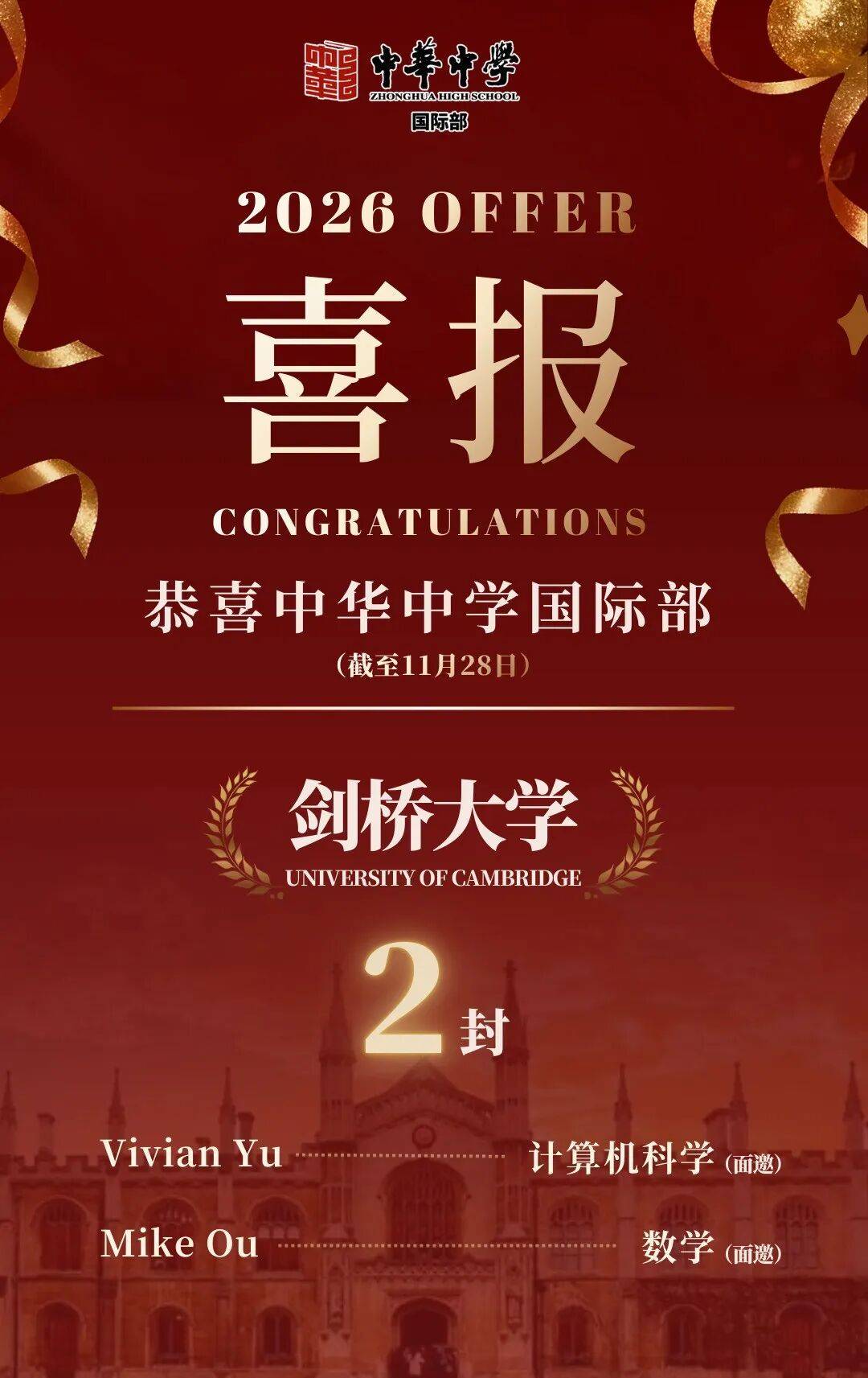 恭喜 南京中华中学国际部,一举斩获 3封牛剑面邀offer,分别是1 封牛津大学地球科学专业的面试邀请,以及2封剑桥大学计算机科学、数学专业的面试邀请!