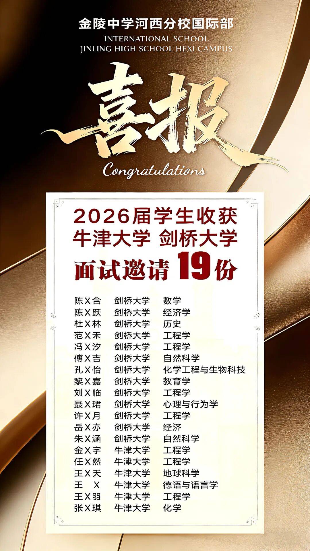恭喜来自 金陵中学河西分校国际部的 19位同学,收获了牛剑面邀,分别是6封牛剑+13封剑桥!