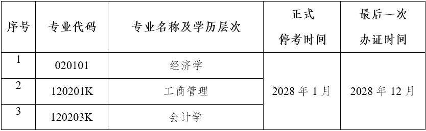 一、经济学、工商管理、会计学三个本科专业从2026年1月起停止新考生报名。对已取得考籍仍未毕业的考生,设置2年过渡期,过渡期内继续安排以上三个专业的课程考试,过渡2年后正式停考,2028年1月起不再安排停考专业相关课程的考试。最后一次办理毕业证时间为2028年12月。
