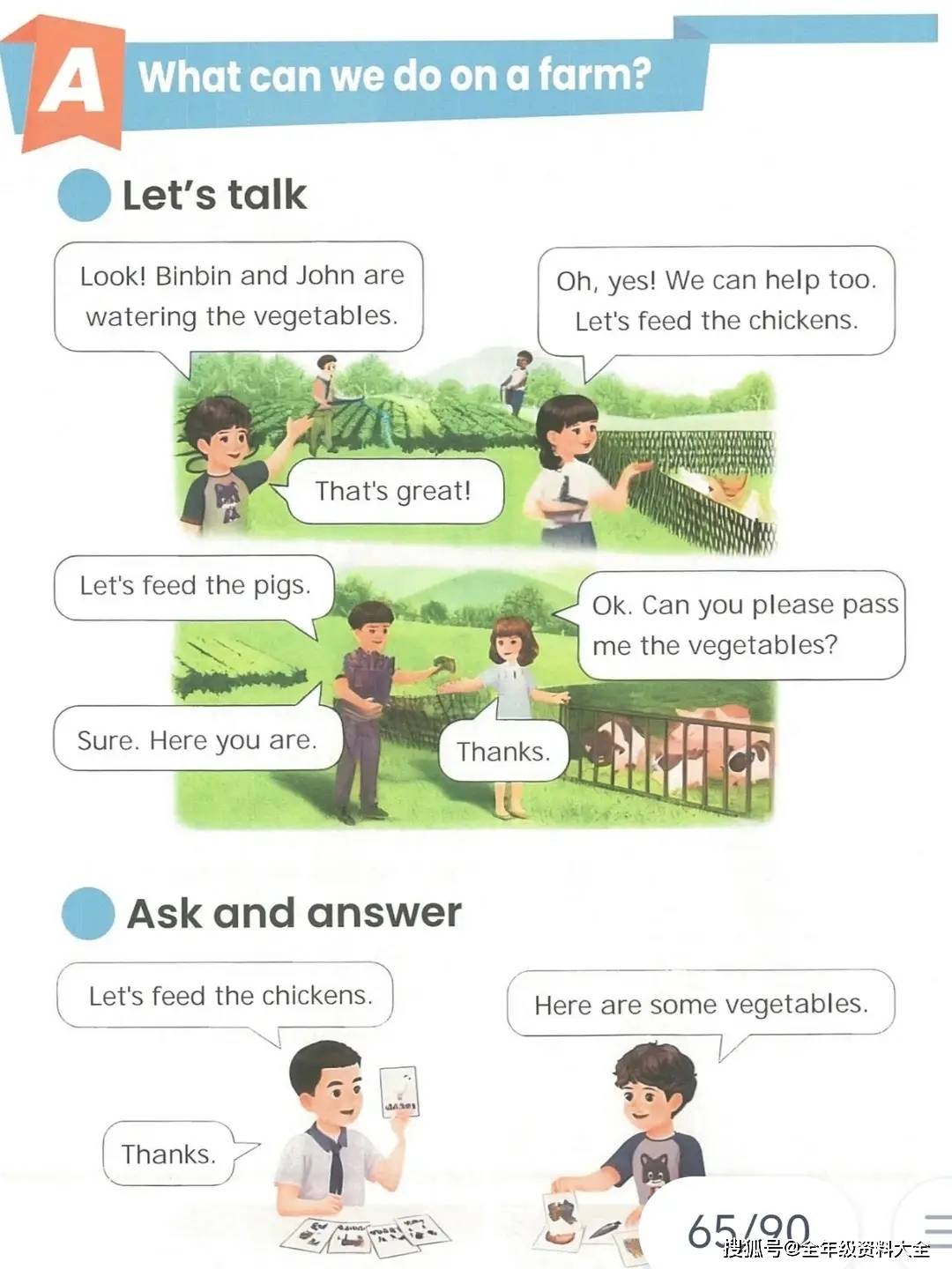 课本里的词汇模块完全贴合四年级下册核心需求,不仅收录了 “class、blackboard、window” 这类课堂高频词,还整理了 “feed the chickens、milk the cows” 等农场活动主题短语,每个单词都搭配课本插图和生活场景,孩子看到 “feed the chickens” 就能联想到农场喂鸡的画面,记单词再也不用死记硬背;句型部分聚焦Let’s.../Can you... 两大核心句型,比如 “Let’s clean the classroom.”“Can you help me?”,每个句型都附课堂对话场景,像小组讨论打扫教室、农场求助小伙伴等,孩子能直接套用句型参与课堂互动,轻松掌握祈使句和请求句型的用法。