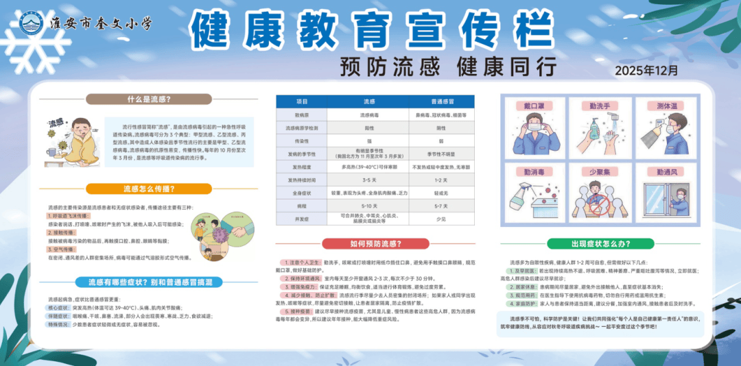 淮安市奎文小学始终将流感等季节性传染病预防摆在重要位置,坚持“早预防、早干预”,把常态化防控措施融入日常教育教学管理,通过系统、细致的举措,营造安全、健康的校园环境。