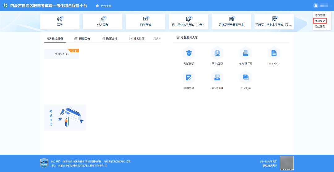 如考生记得密码且原注册手机号已停用,考生可登录“内蒙古自治区教育考试院考生综合服务平台”,点击右上角本人姓名,点击“手机变更”,把停用手机号改为本人可用手机号。