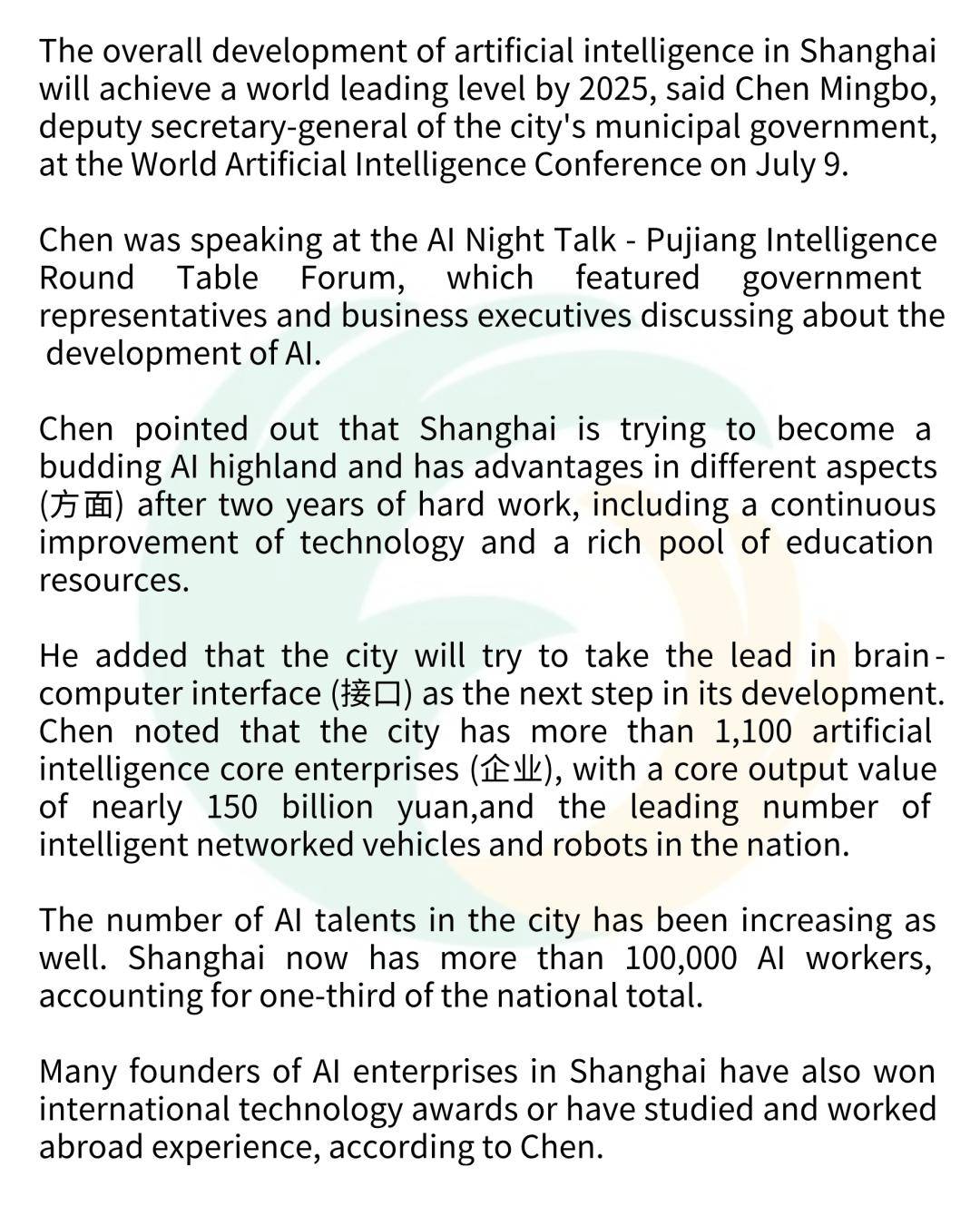 解析:写作意图题。文章首先介绍了在上海召开的人工智能的会议及到2025年上海人工智能的发展目标,然后介绍目前上海人工智能的现状及未来工作方向,故选“To tell us the present and future development of AI in Shanghai ”