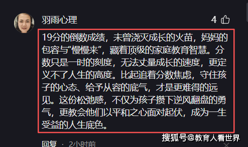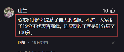 分数终究只是阶段的刻度,它量不出成长的全部轨迹,更定义不了人生的最终高度。有网友评论得犀利:“守住孩子的心态、给予从容的底气,才是更难能可贵的远见。”视频没有交代,那个考19分的小男孩后来是否进步了。但我们愿意相信,他一定会越来越好——因为他拥有一位懂得如何解读他不安、珍视他努力的妈妈。她深深懂得,比起冷冰冰的分数,更重要的是孩子是否还拥有面对下一次考试的勇气。
