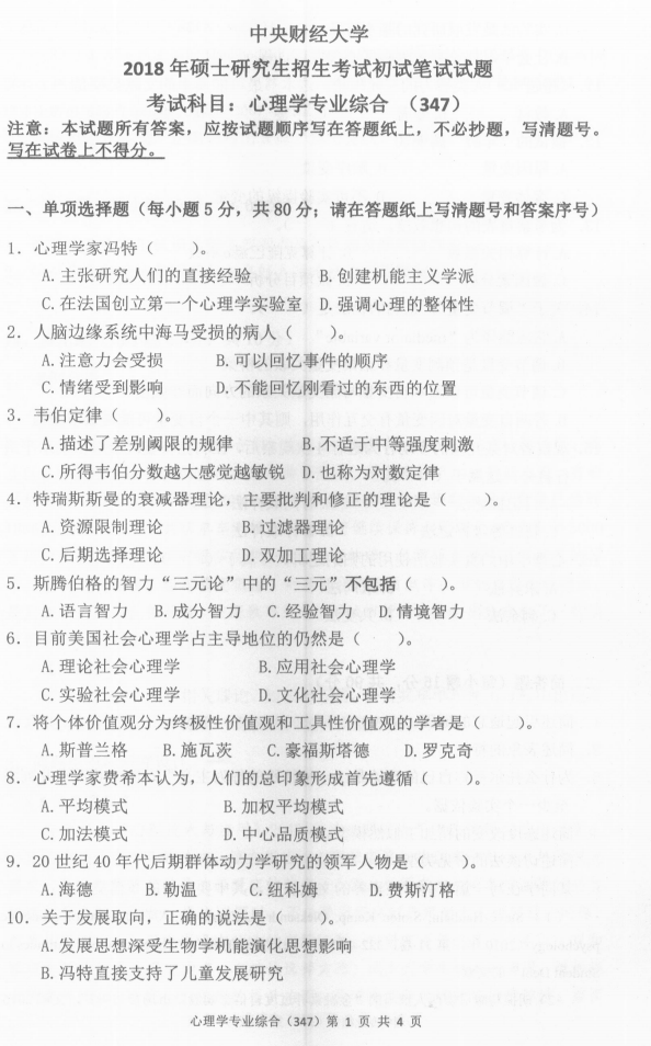 2018年中央财经大学347心理学专业基础综合考研真题试卷与参考答案