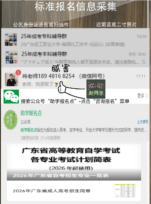 1.联系老师:选择报读的层次和学校(可如下图“腻害”肖老师),信息引用来源:“助学报名点”公众号