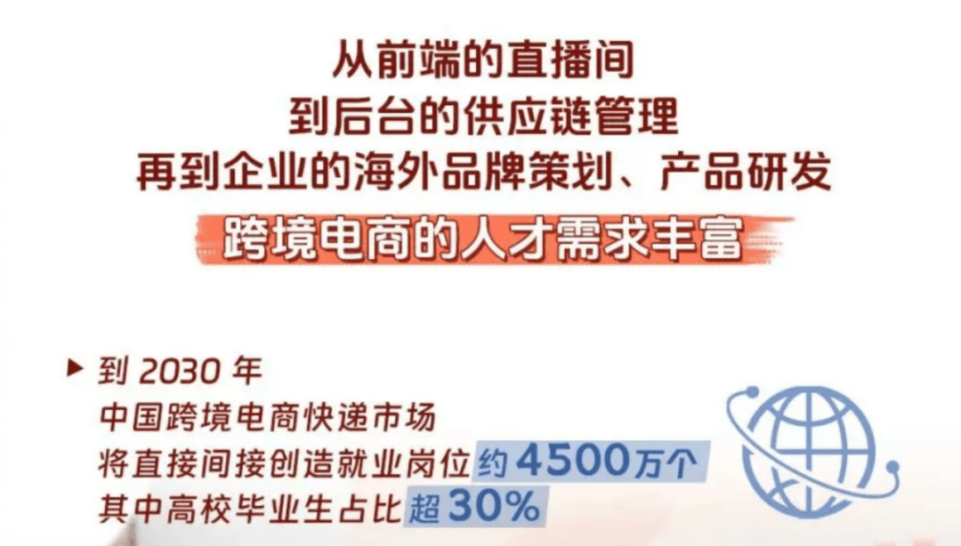 据新华社报道,到2030年,中国跨境电商快递市场将直接间接创造就业岗位约4500万个,其中高校毕业生占比超30%。